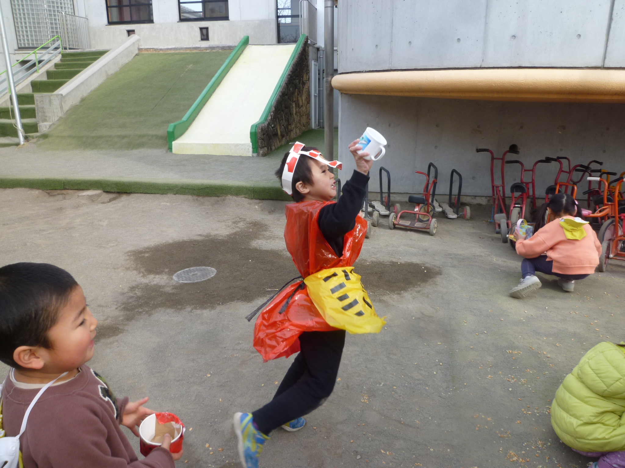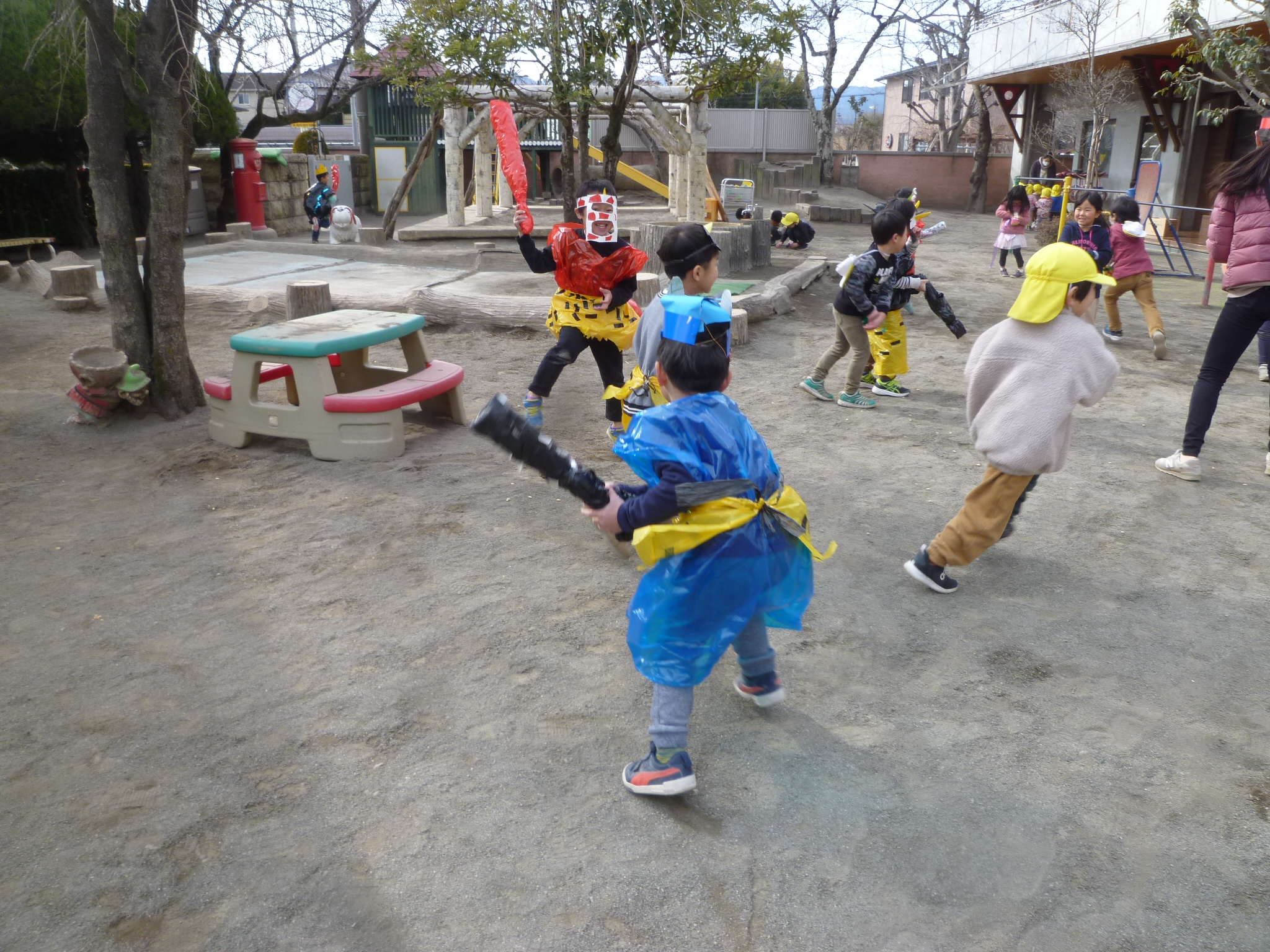 園長先生に見せたかったのか、園長をやっつけたかったのか(笑)「園長先生いる?」と金棒を持って入ってきた子ども達。