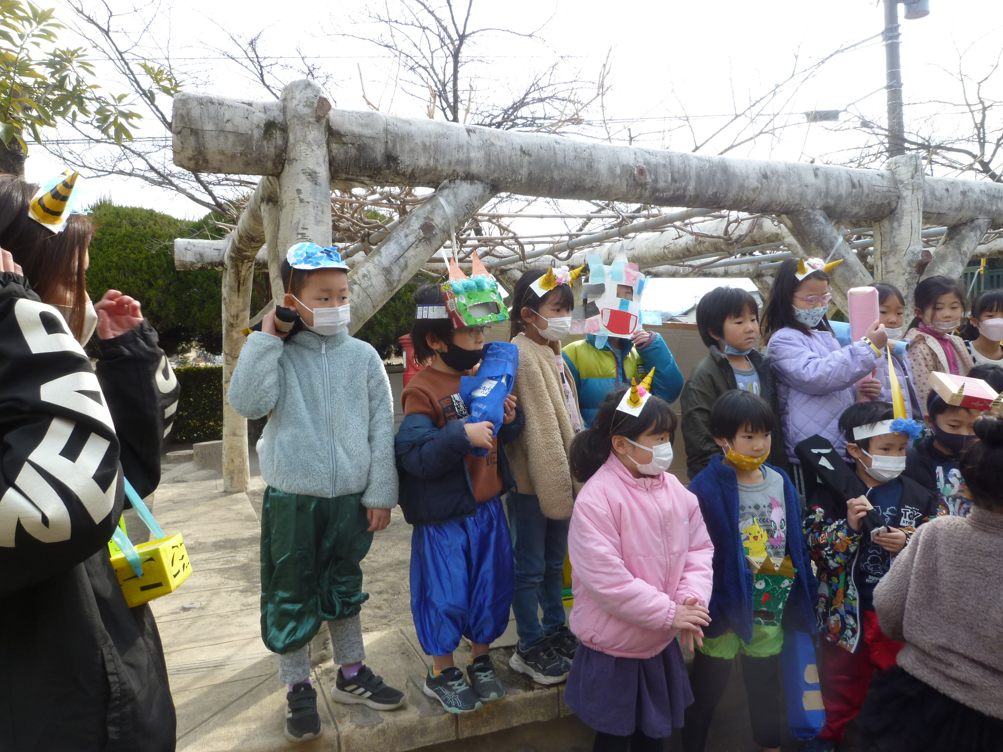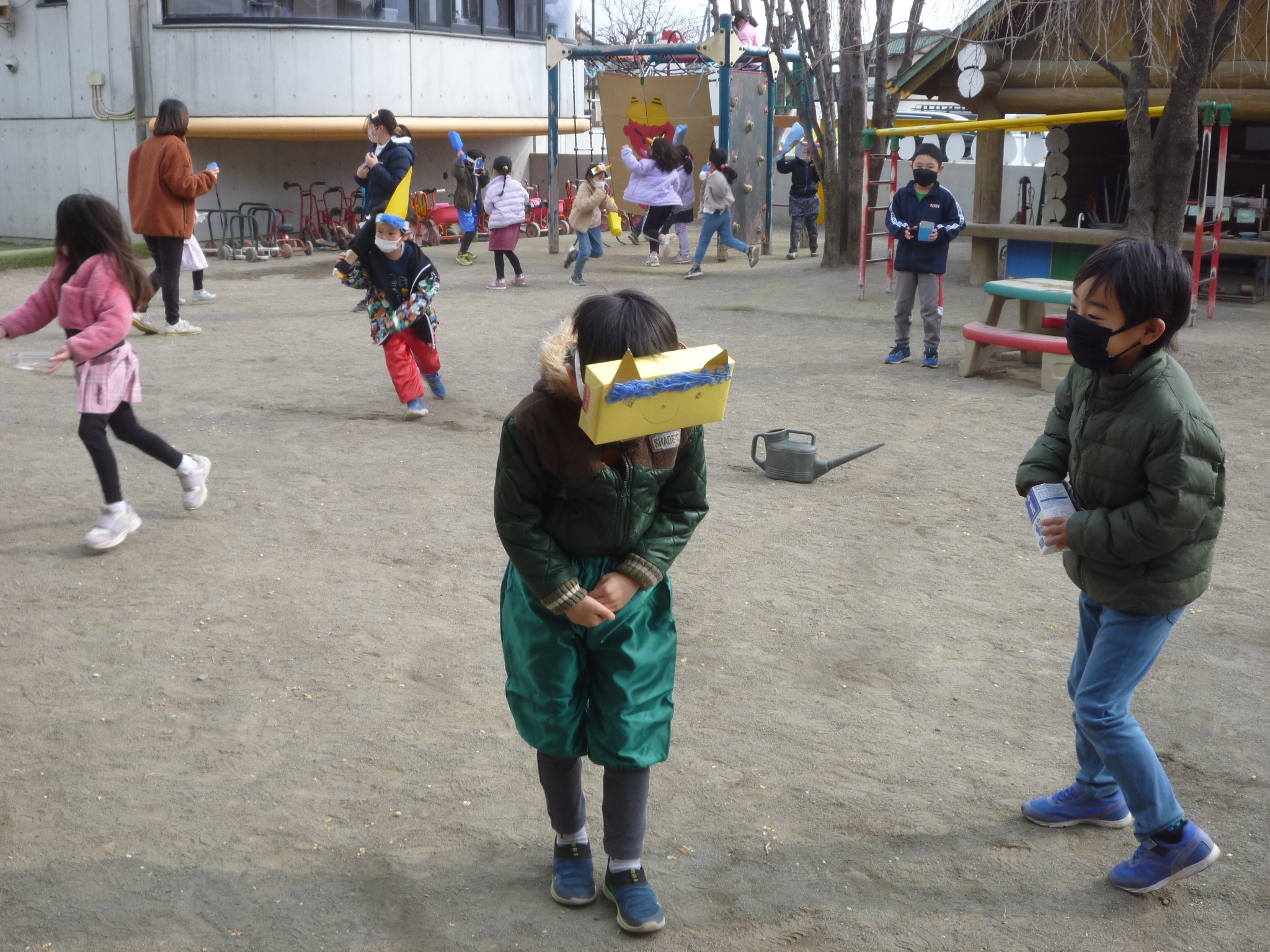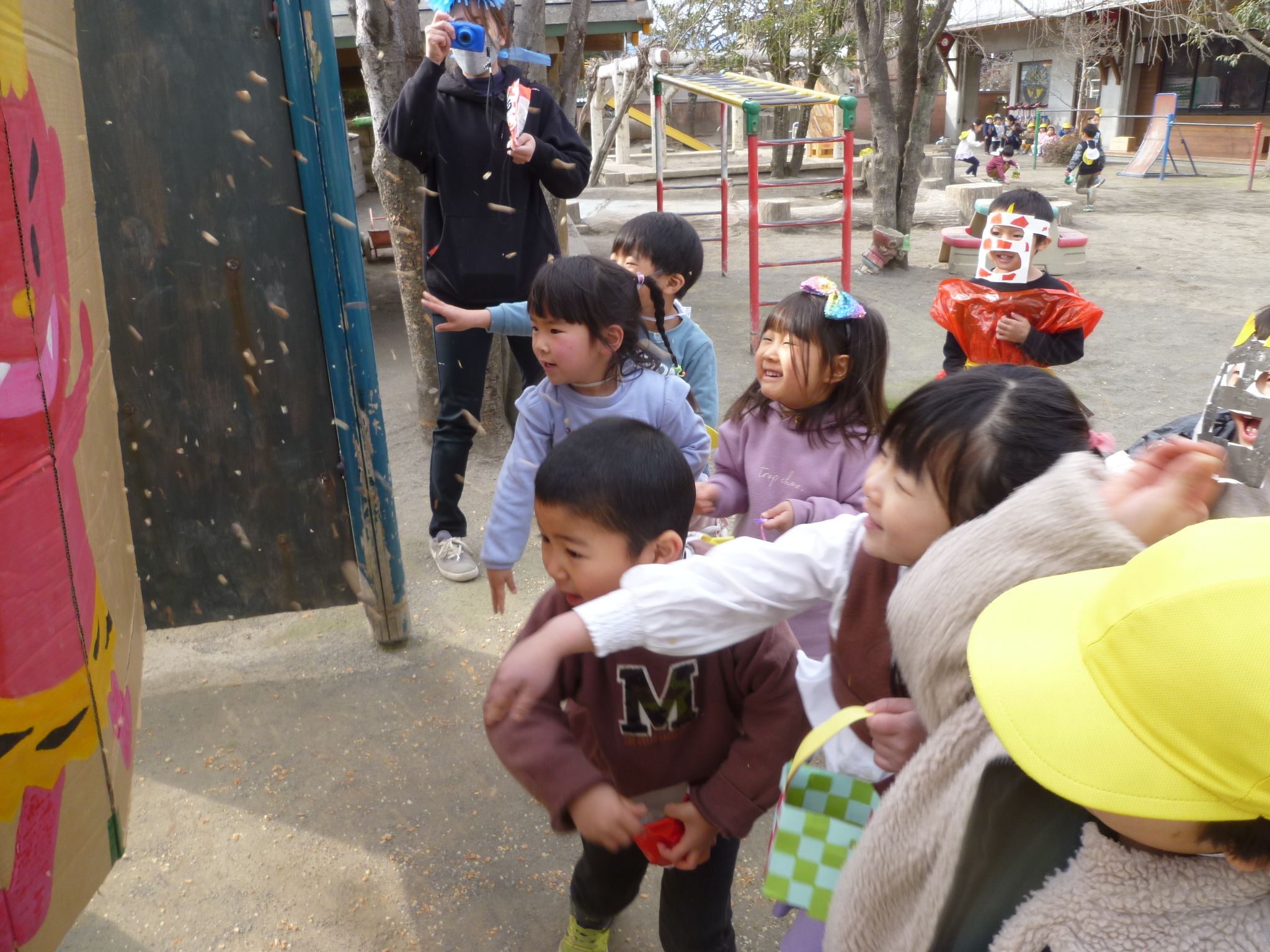 子ども達の中で鬼役になりたい子が「ぼく鬼になる」「私も!」と手を挙げてくれそれぞれ思い描く鬼を作りそれを身につけて豆まきが始まります。