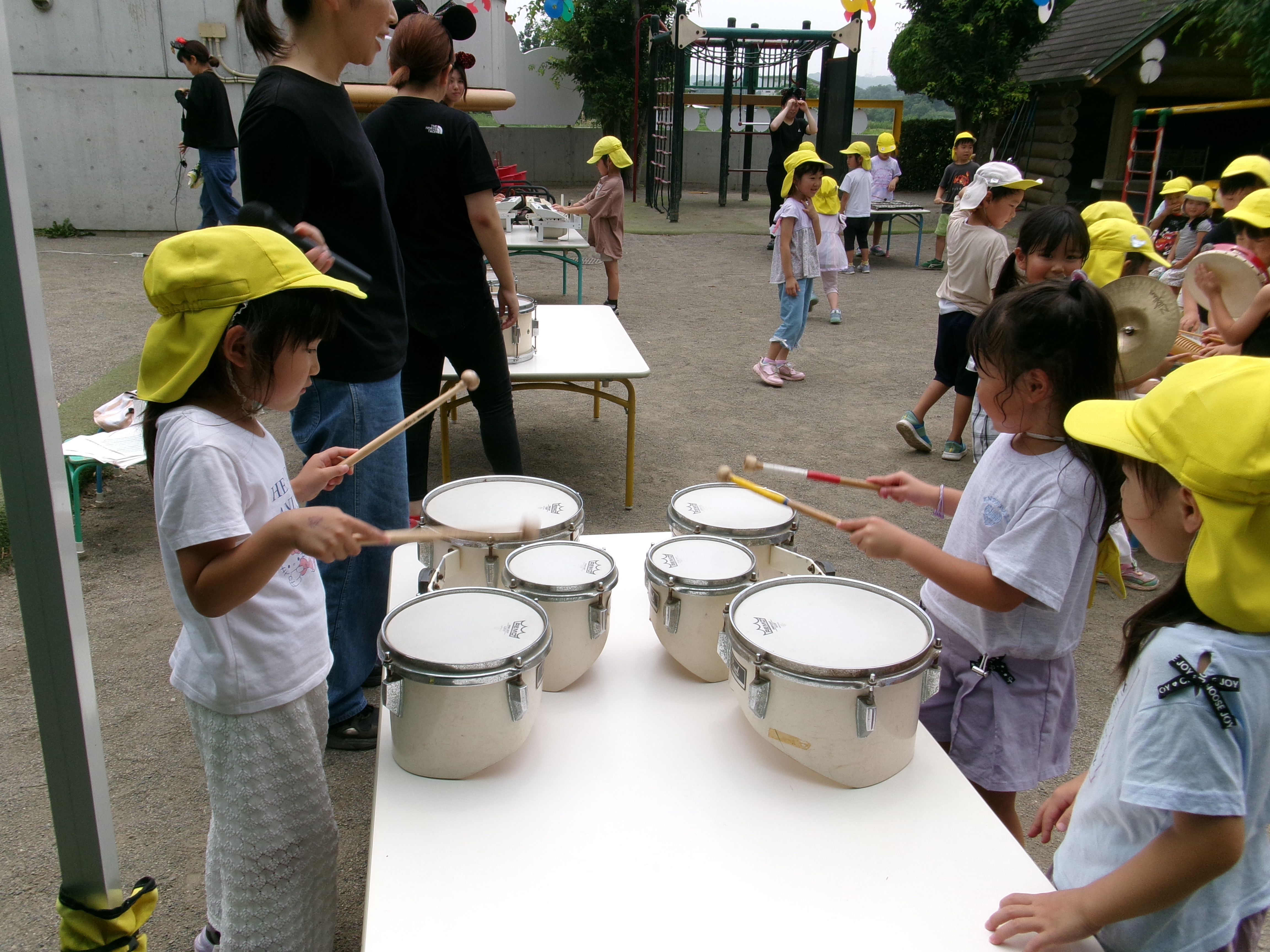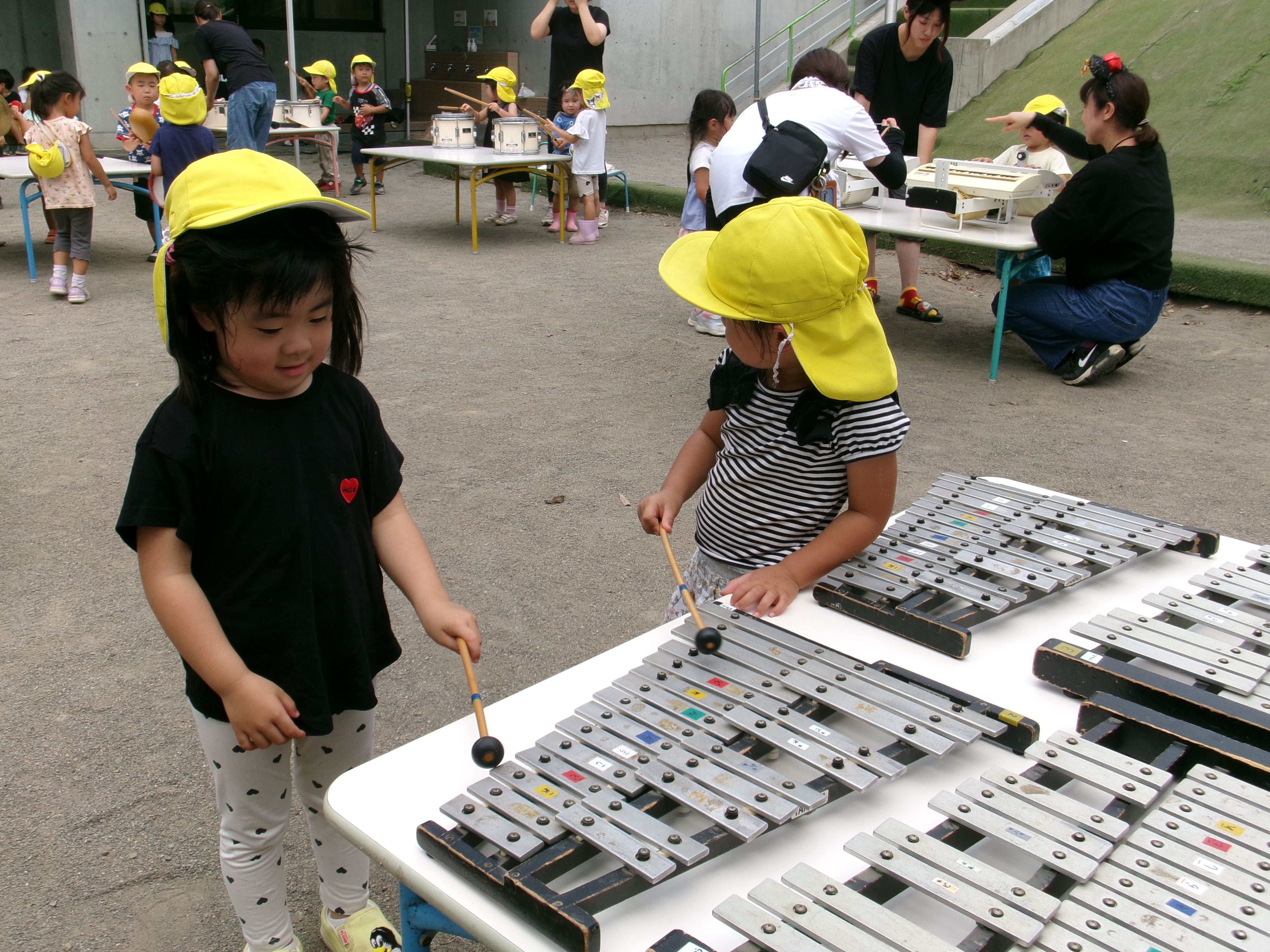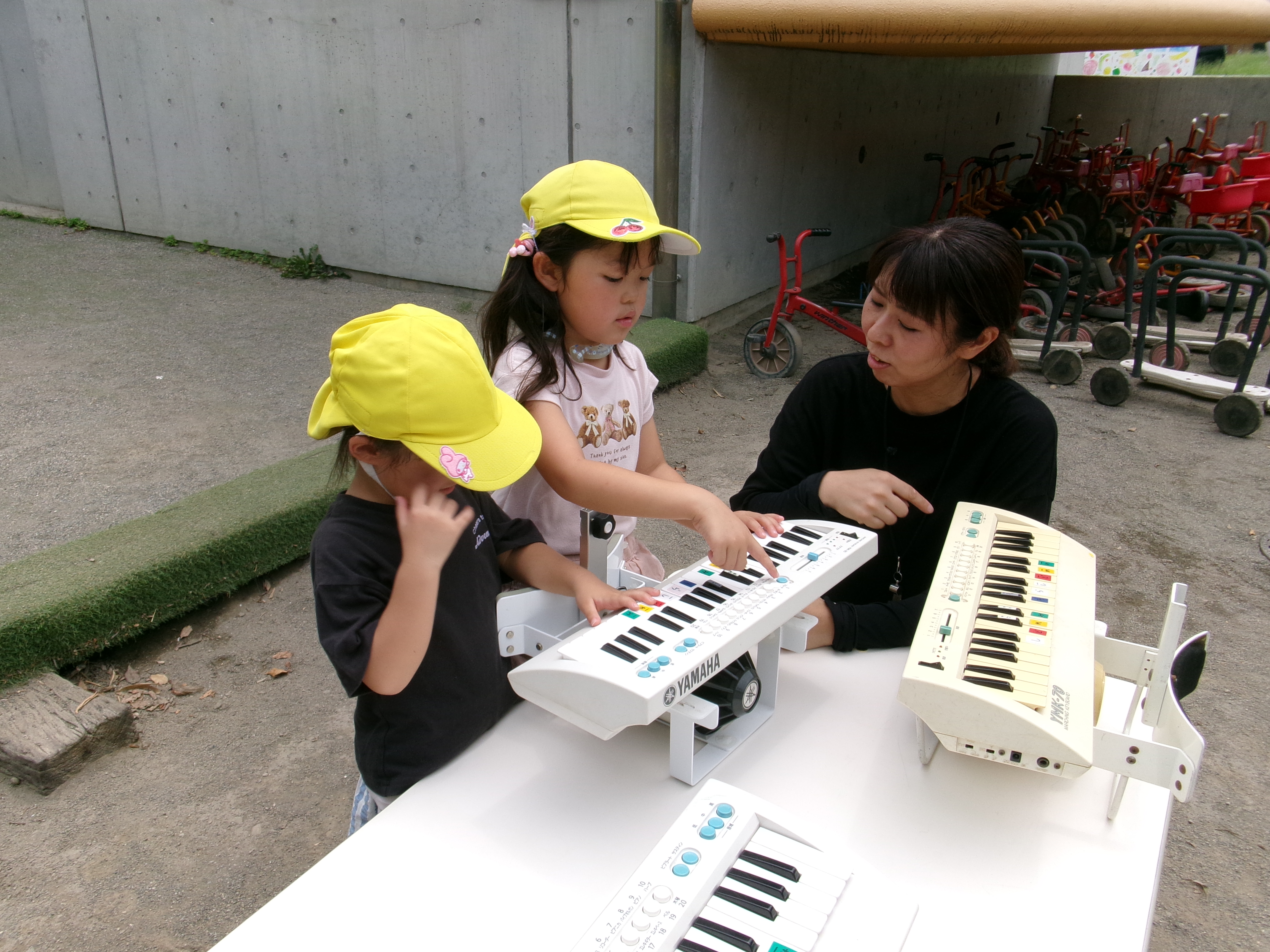 トトロの「さんぽ」と「ミッキーマウスマーチ」の2曲弾いてくれ、その後は実際に子ども達に楽器を触ってもらいました。