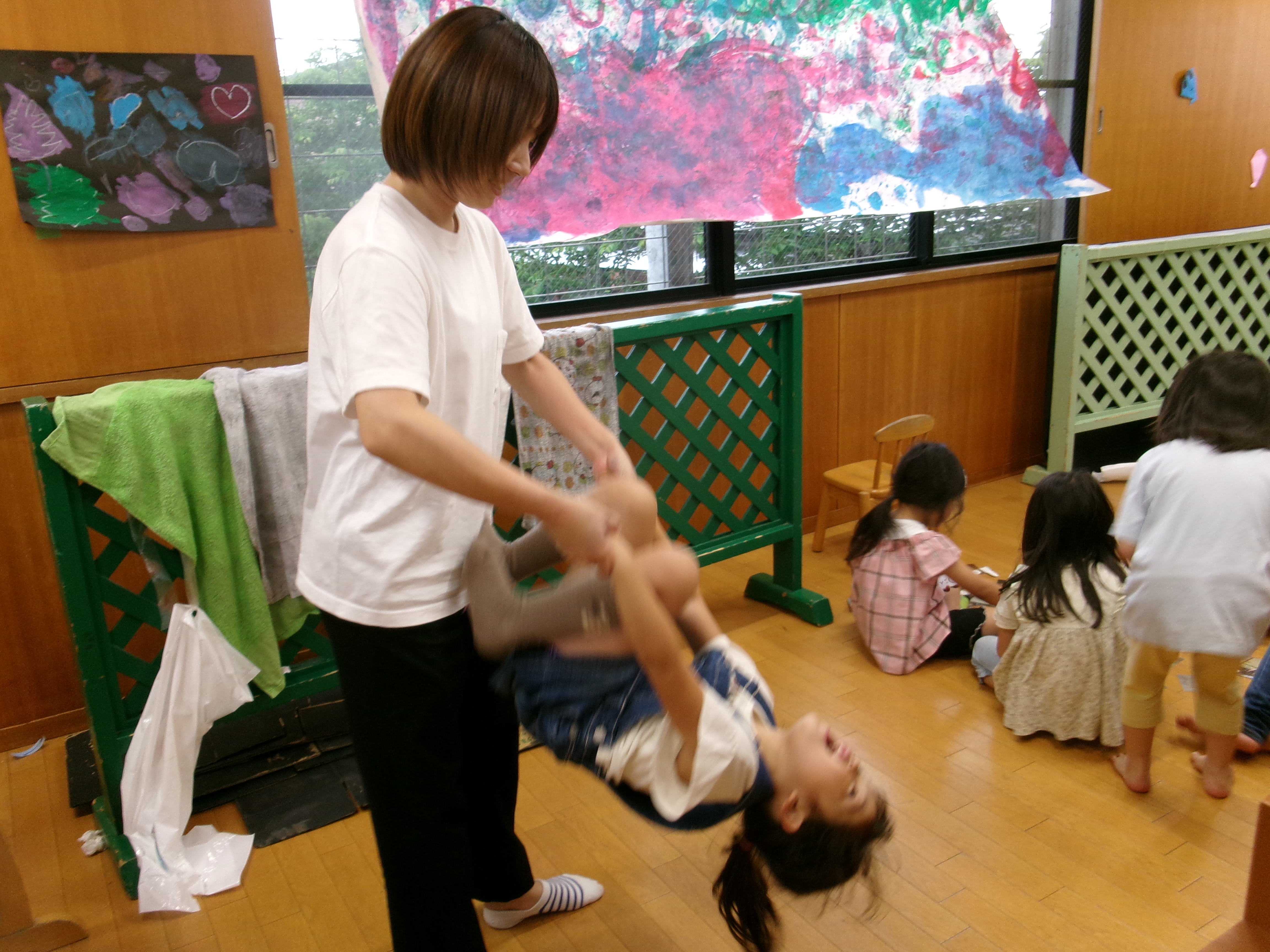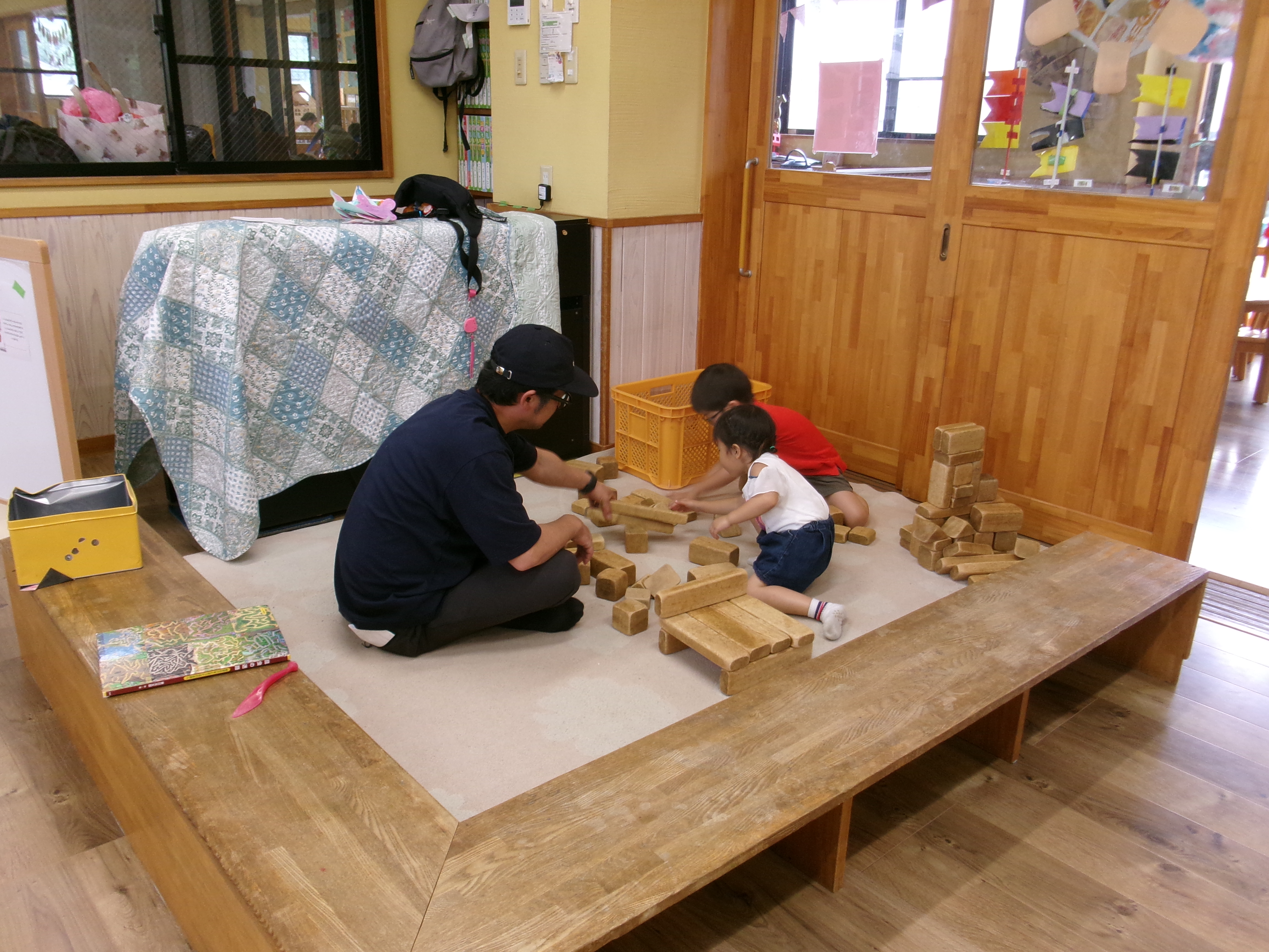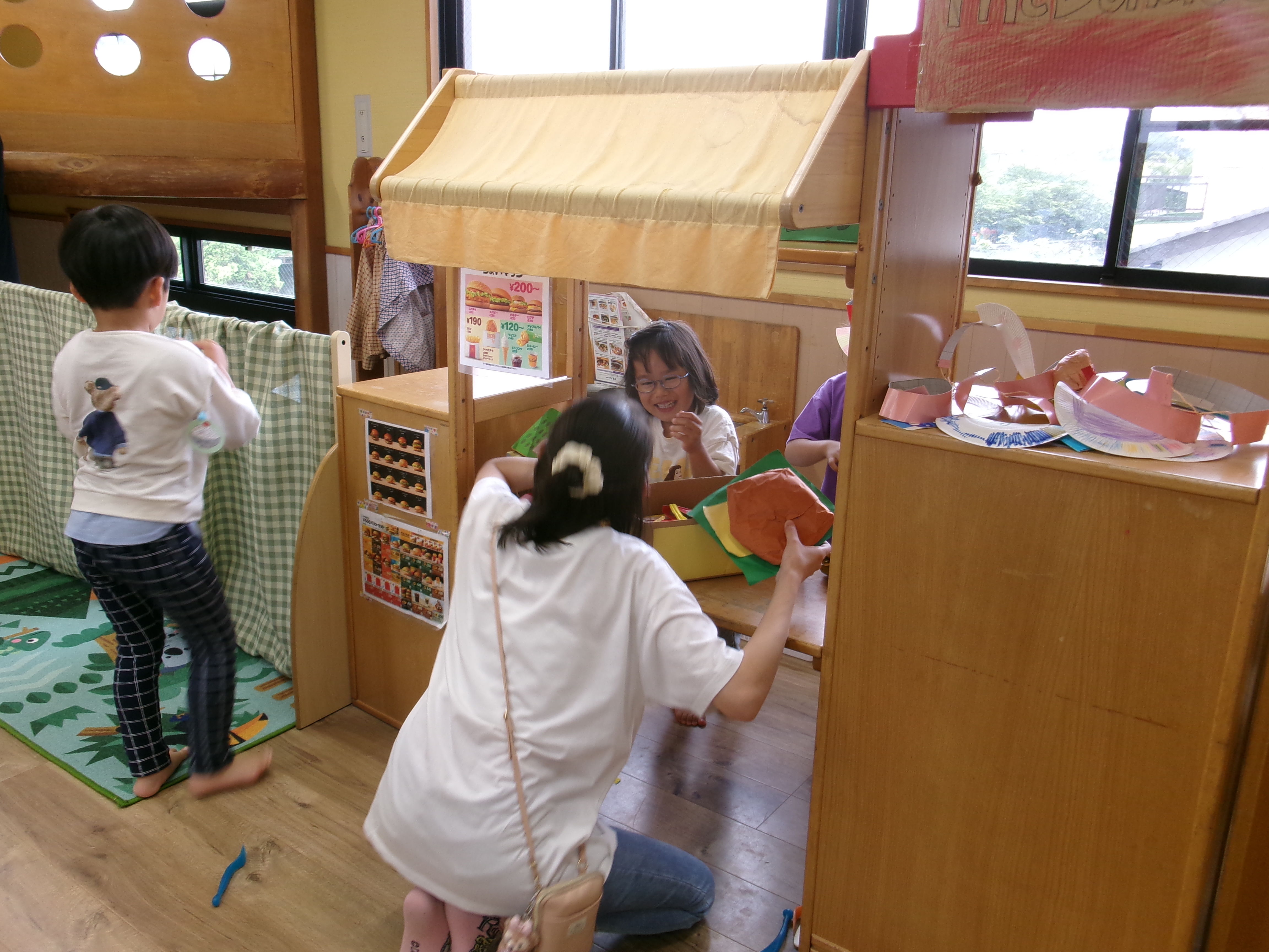 でも、子ども達は体を動かしたくて、テラスで体を使ってあそんだり、お母さんの体を鉄棒のように使ってくるりと回ったり、お父さんと室内かくれんぼを楽しんでいる姿がありました。