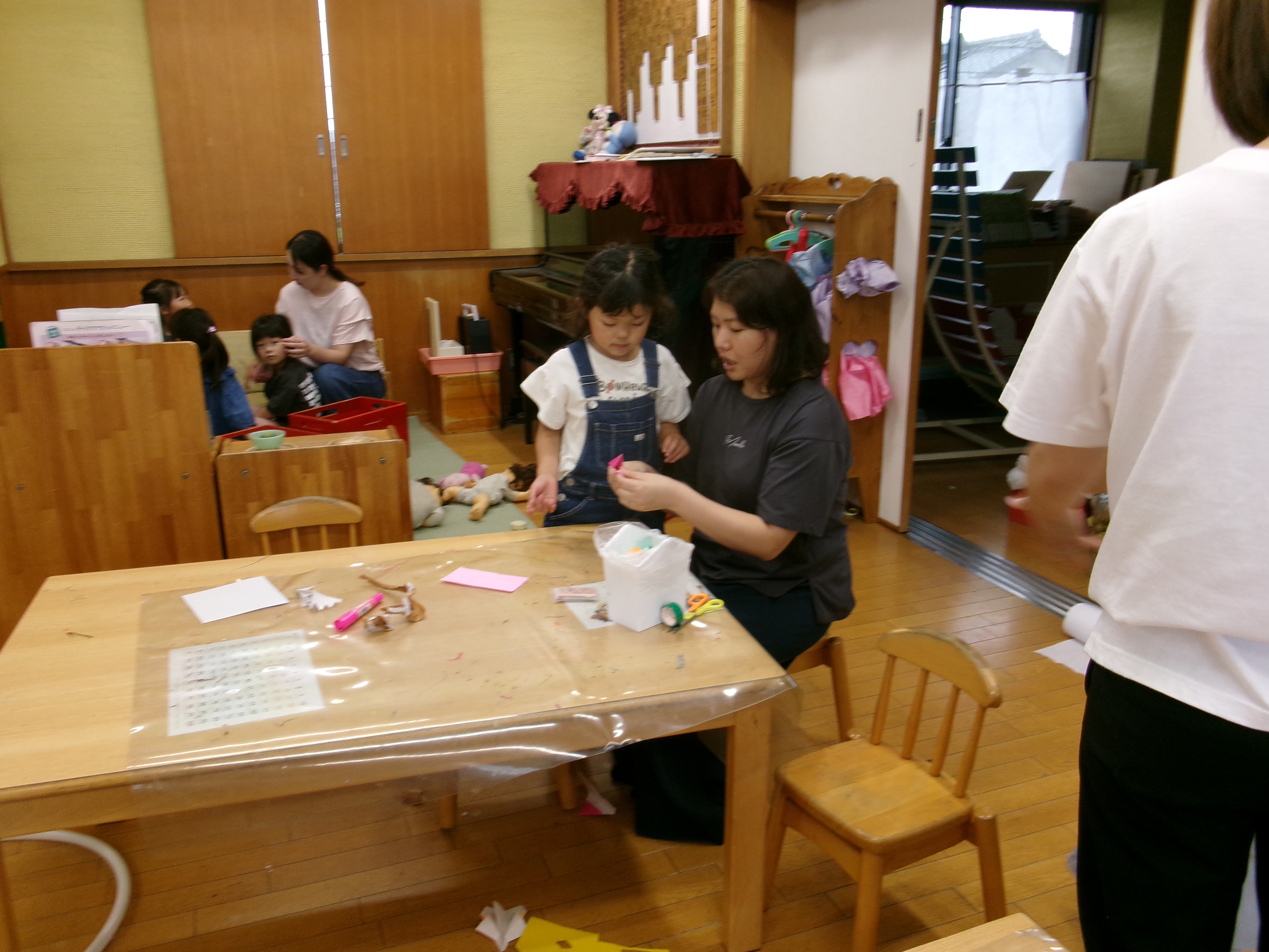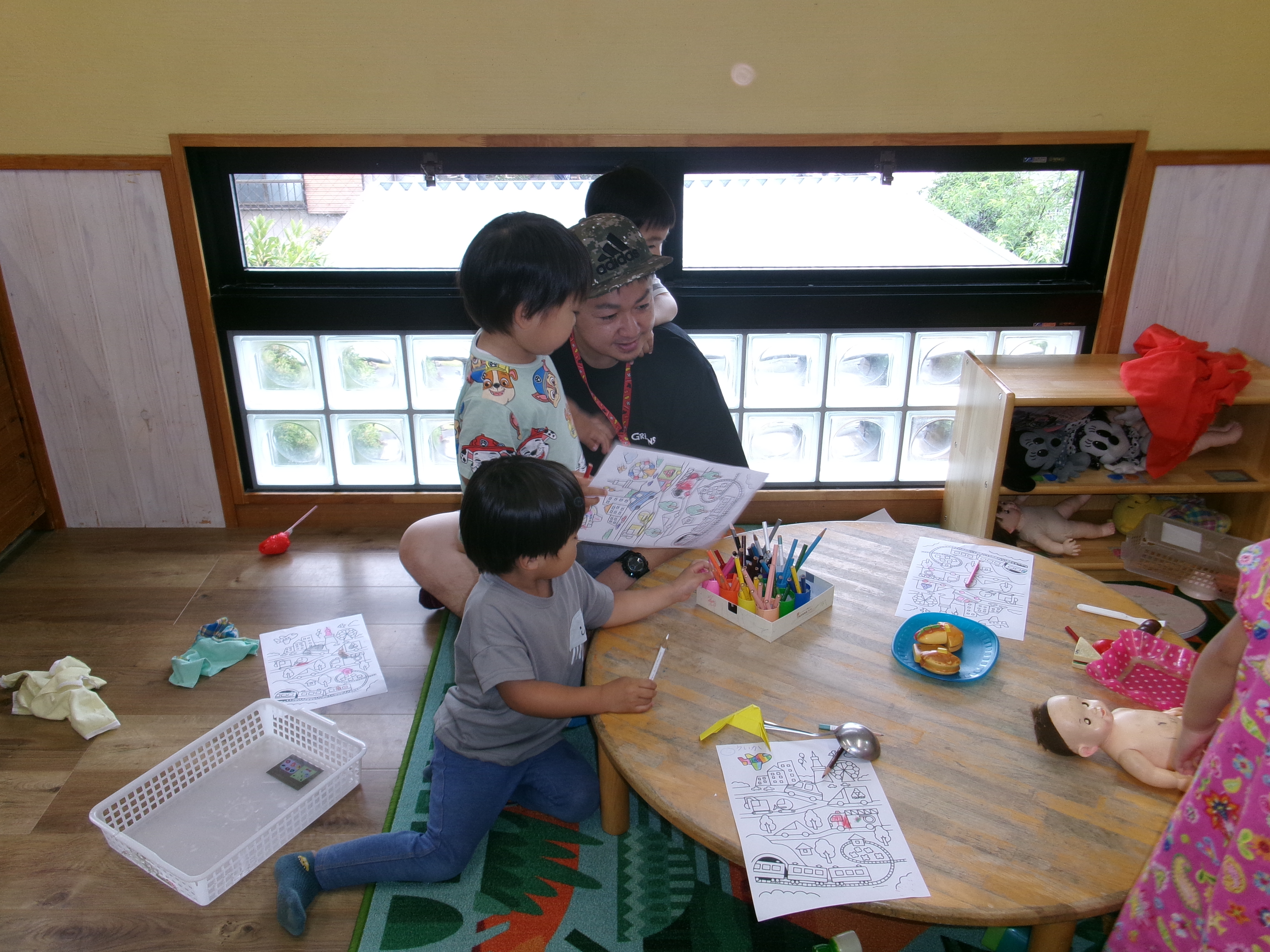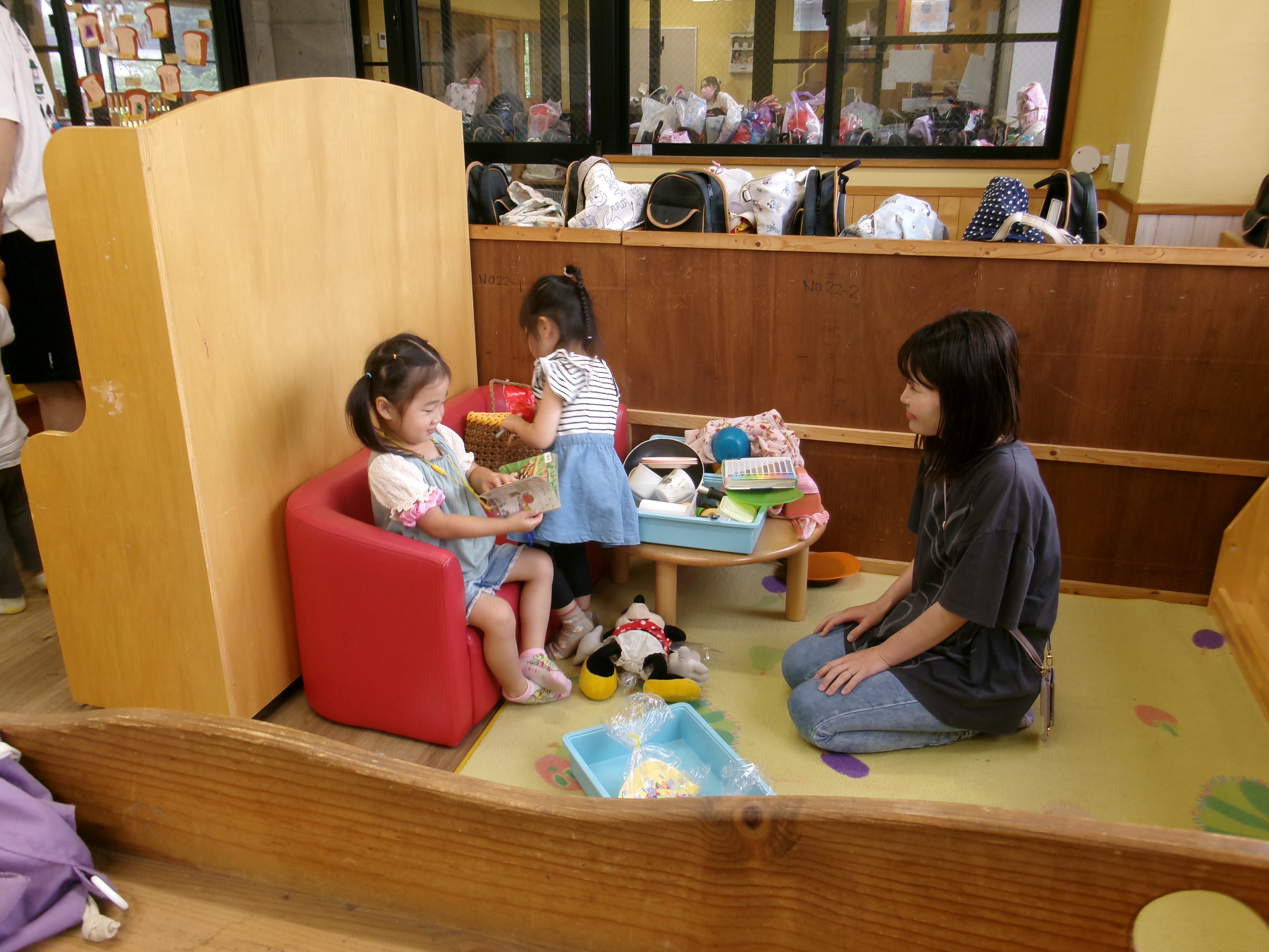でも、子ども達は体を動かしたくて、テラスで体を使ってあそんだり、お母さんの体を鉄棒のように使ってくるりと回ったり、お父さんと室内かくれんぼを楽しんでいる姿がありました。