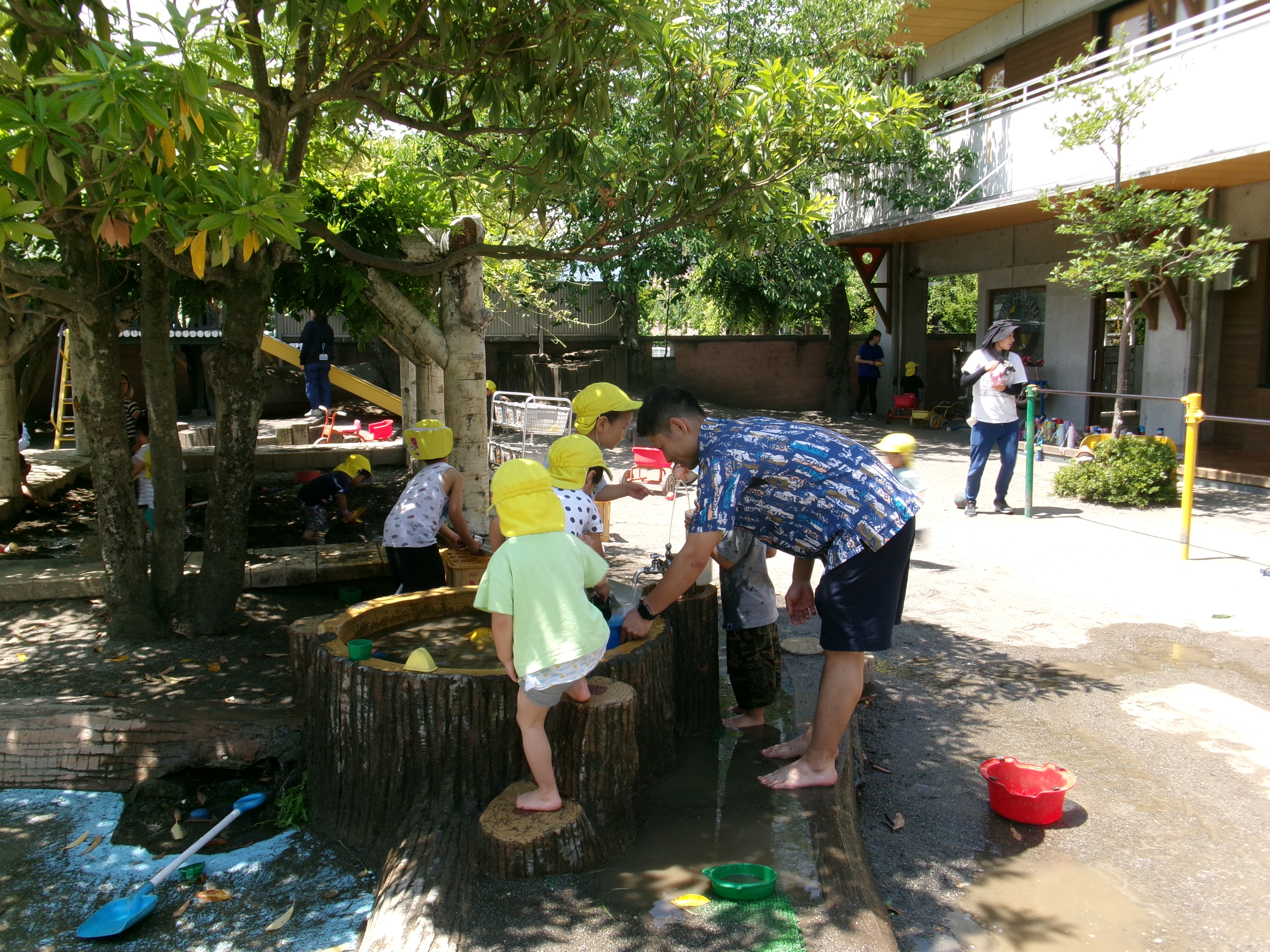 今日は水遊びもダイナミックになり、お父さんも裸足になって子ども達と水遊びを楽しんでいただきました。