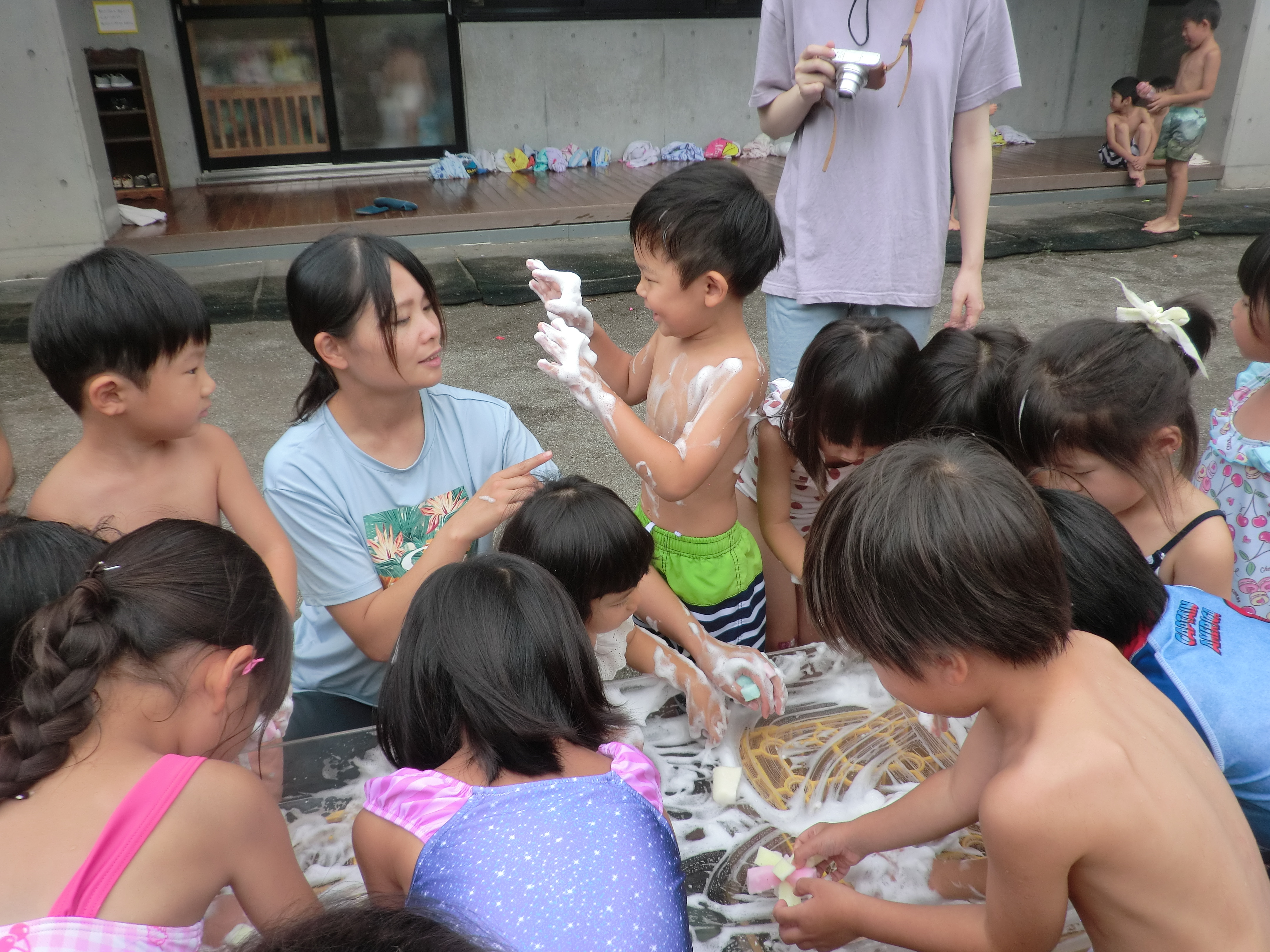 2024/8/23 夏ならでは! 昨日は8月の子の誕生会がありました。 誕生会後のお楽しみ会では、以上児クラスは園庭で水遊びをしました! 「色水あそび」や「泡を作ってみよう」、「大きな紙に絵を描こう」、「水を入れてみよう」などコーナーがあり、思い思いの場所で水を楽しんでいました。 まだまだ毎日暑いですが、 夏も後半になり夏ならではの水遊びを思う存分楽しみました。 最後には、保育者と水の掛け合いで終了しました。