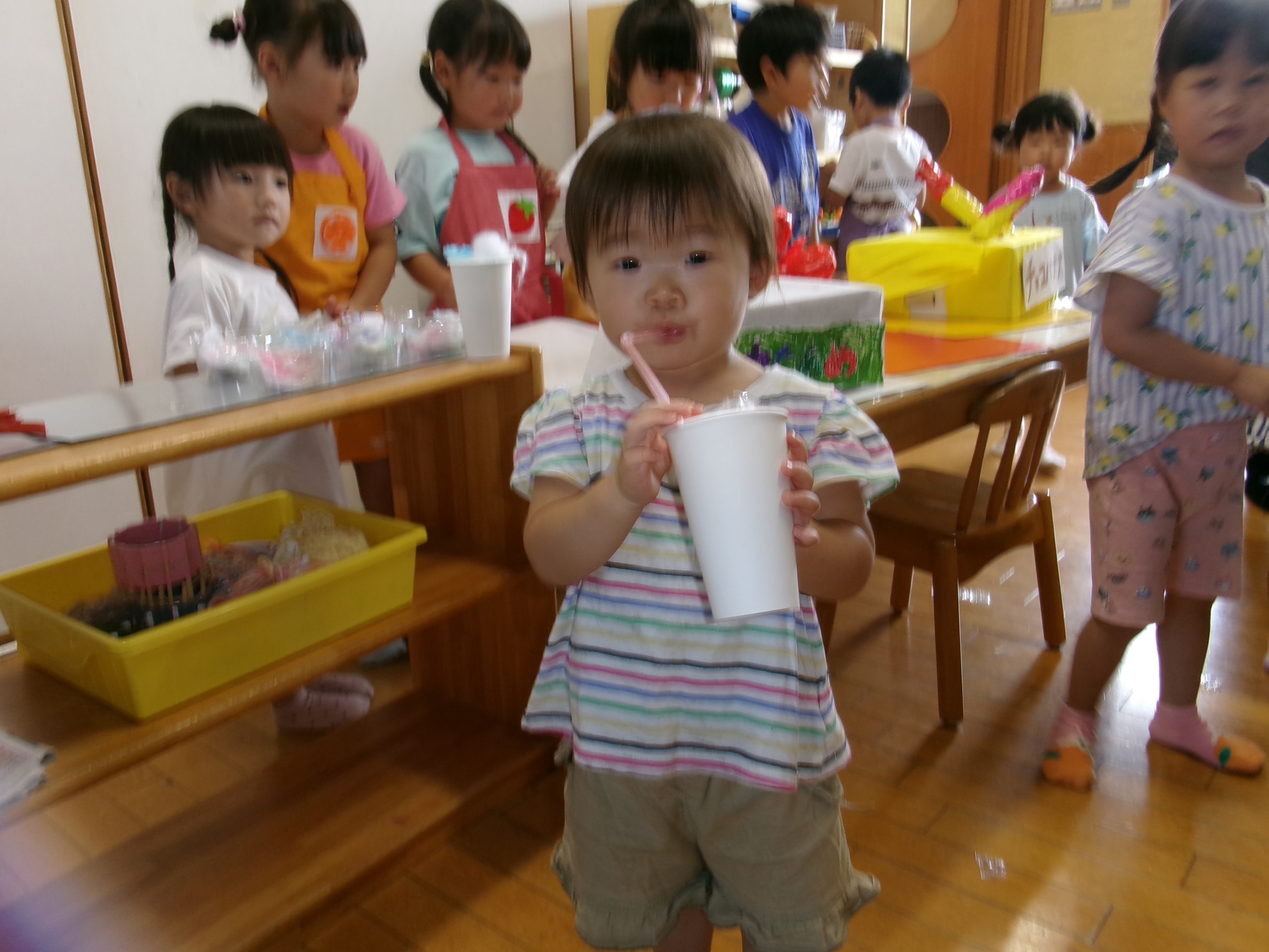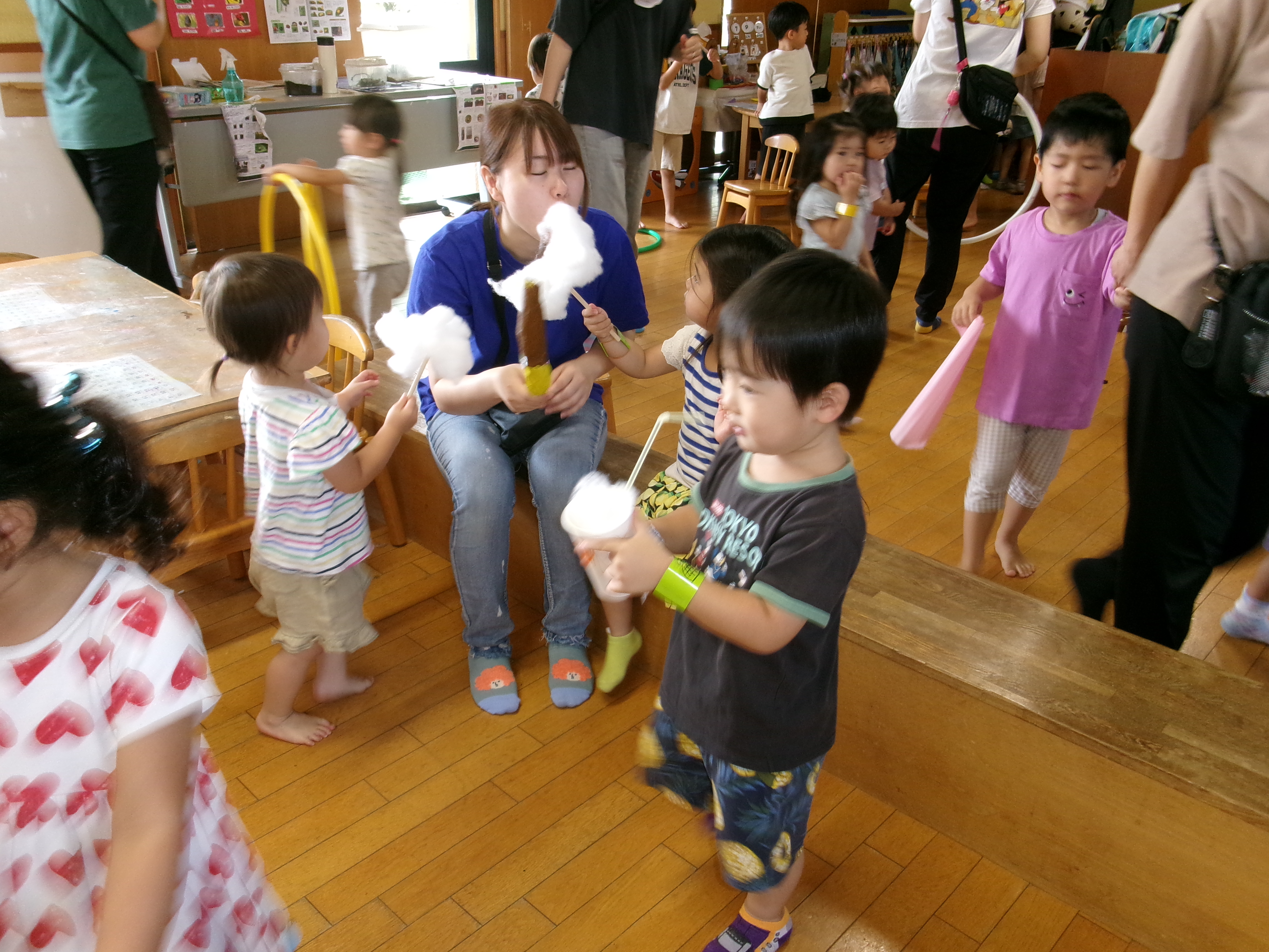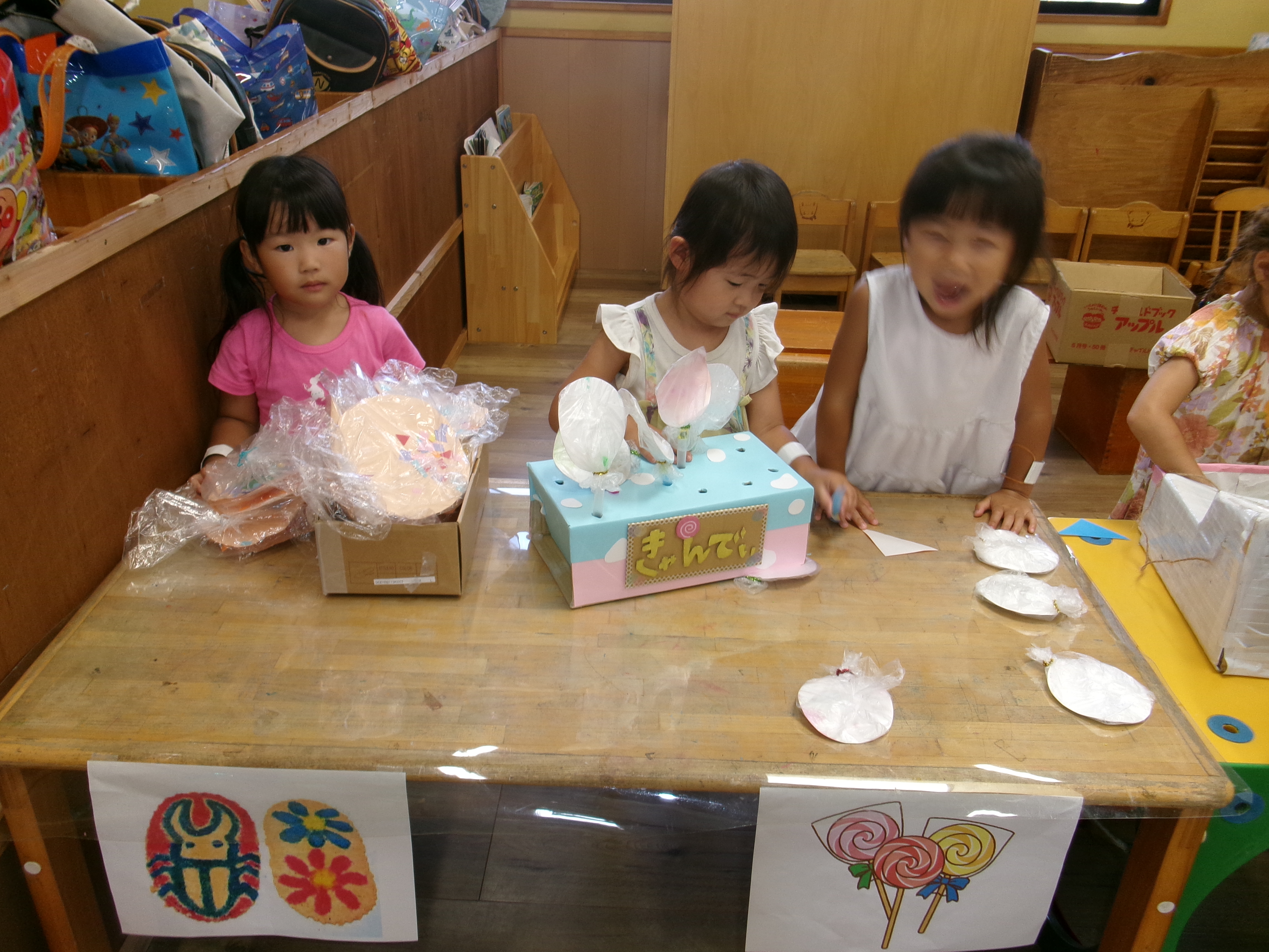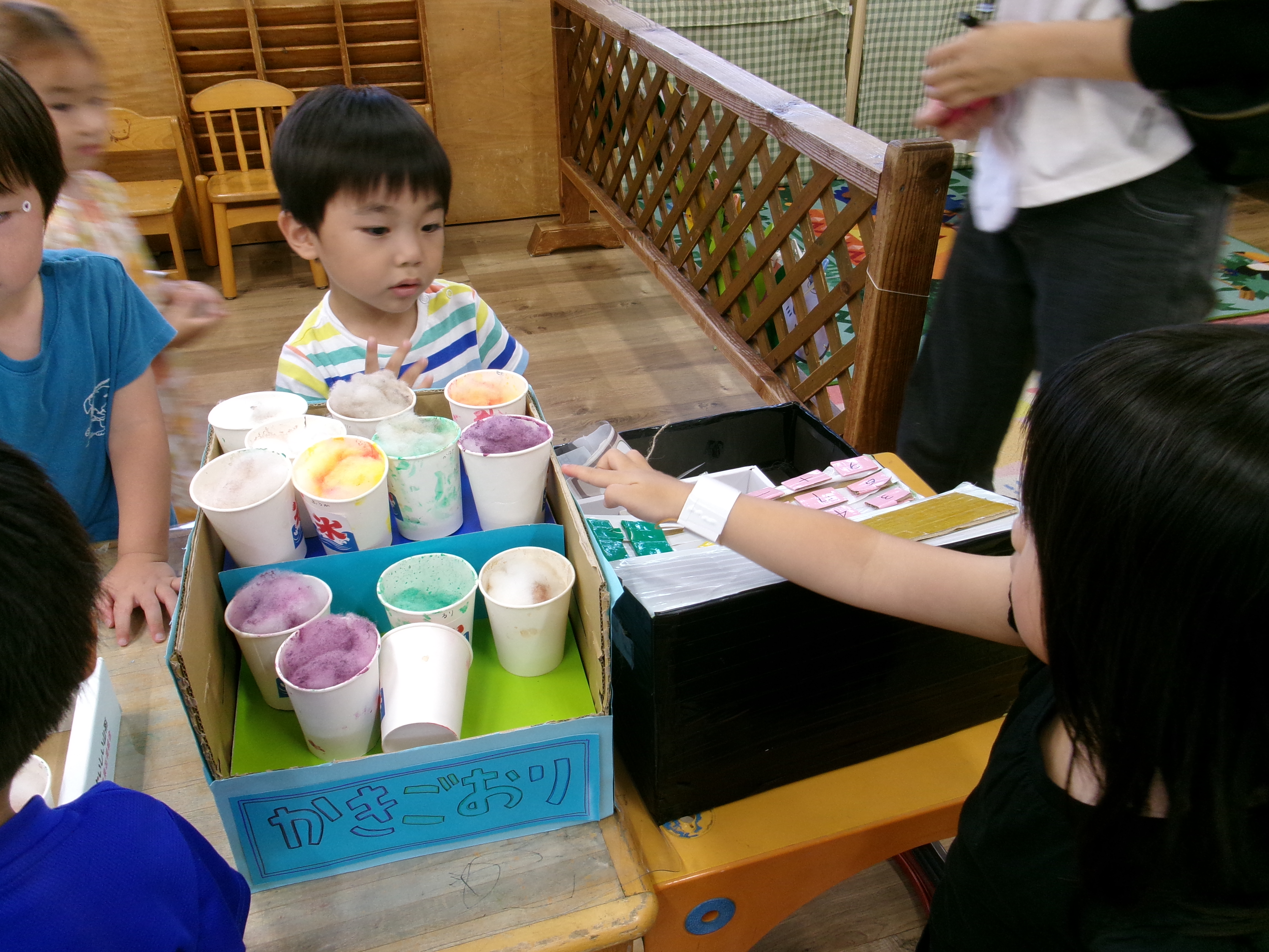ひよこ組では子ども達が作った綿菓子、かき氷、りんご飴、落書きせんべいなどの出店が出ており、子ども達がお店屋さんにもなってくれました。