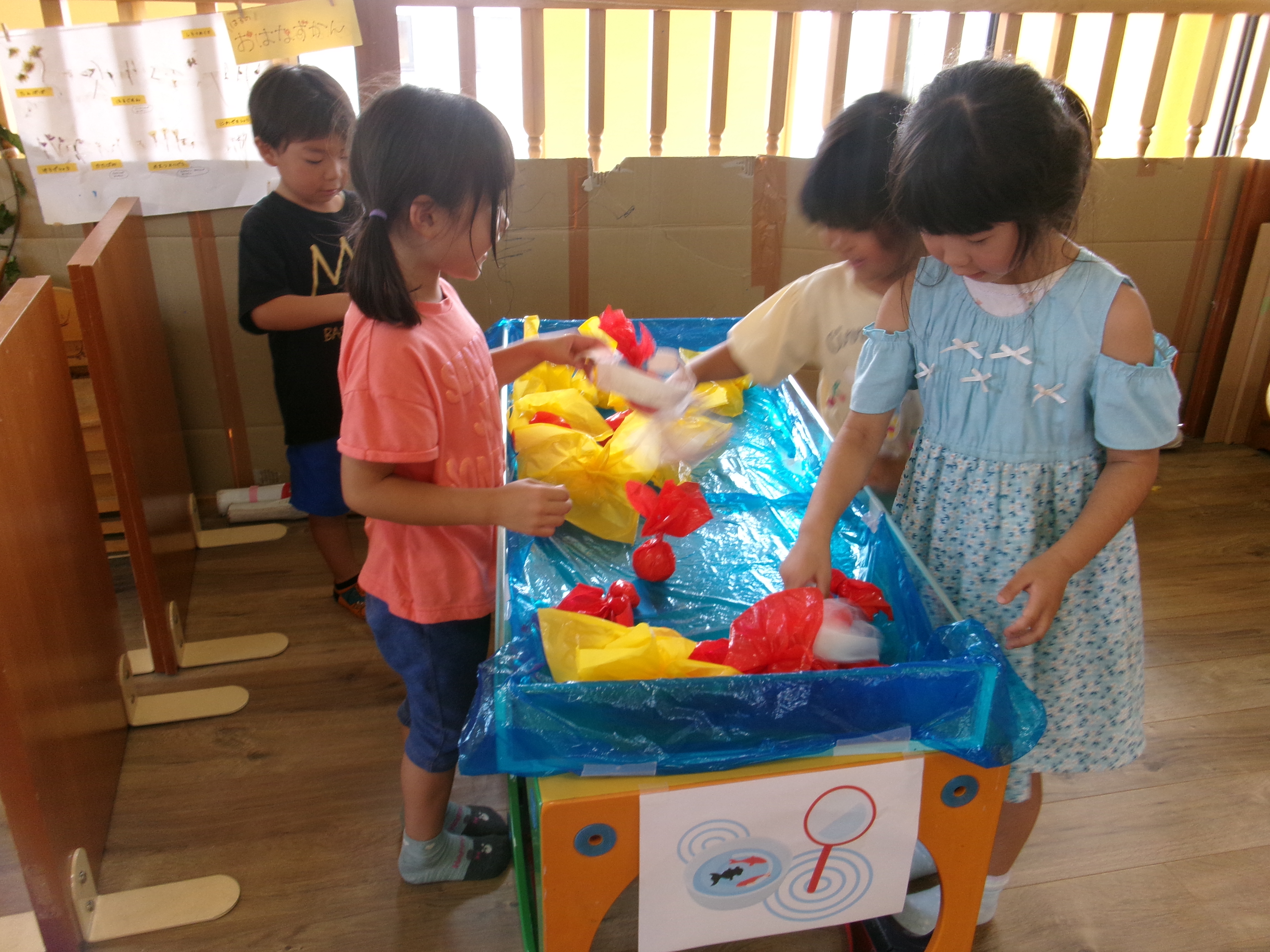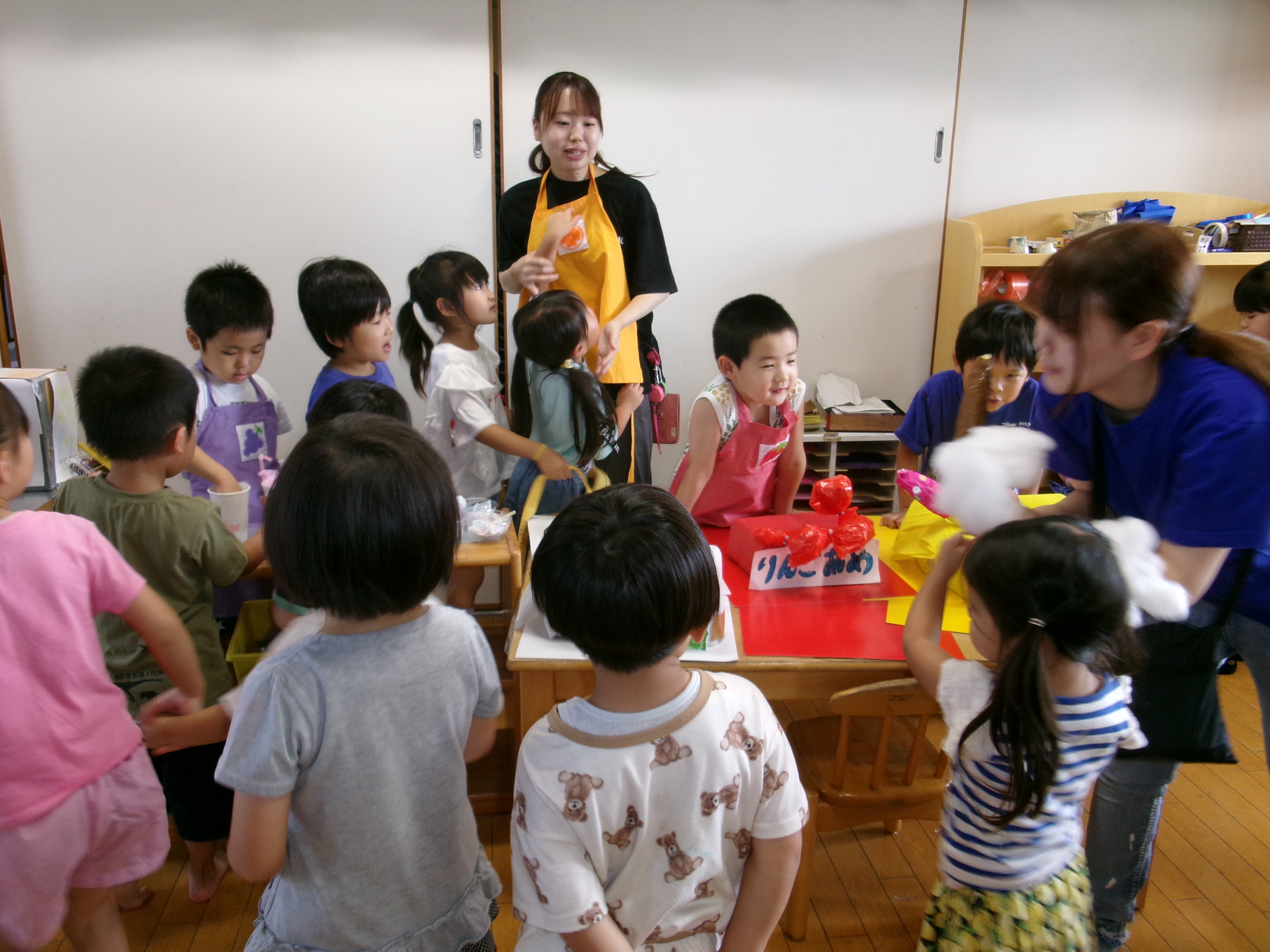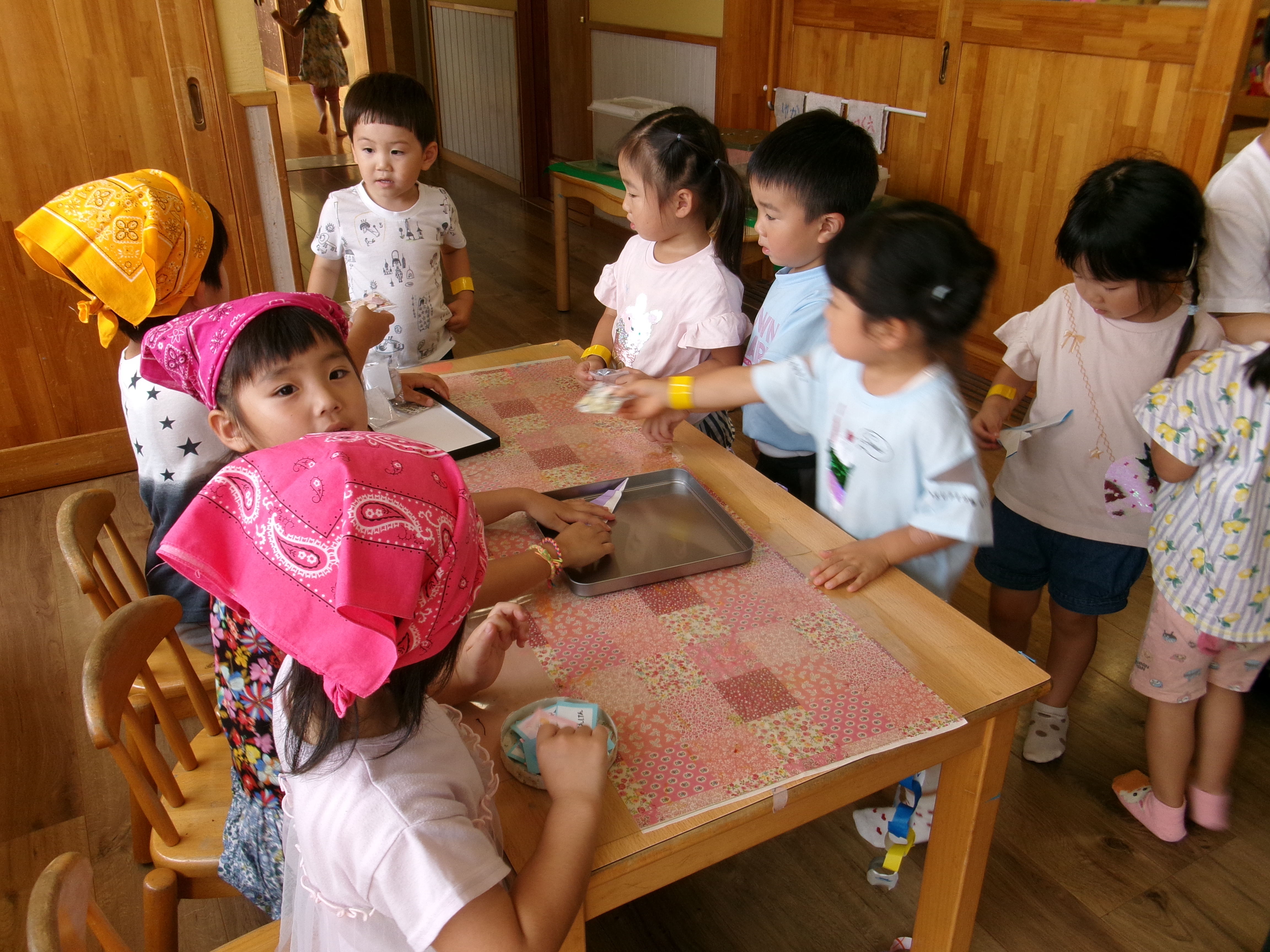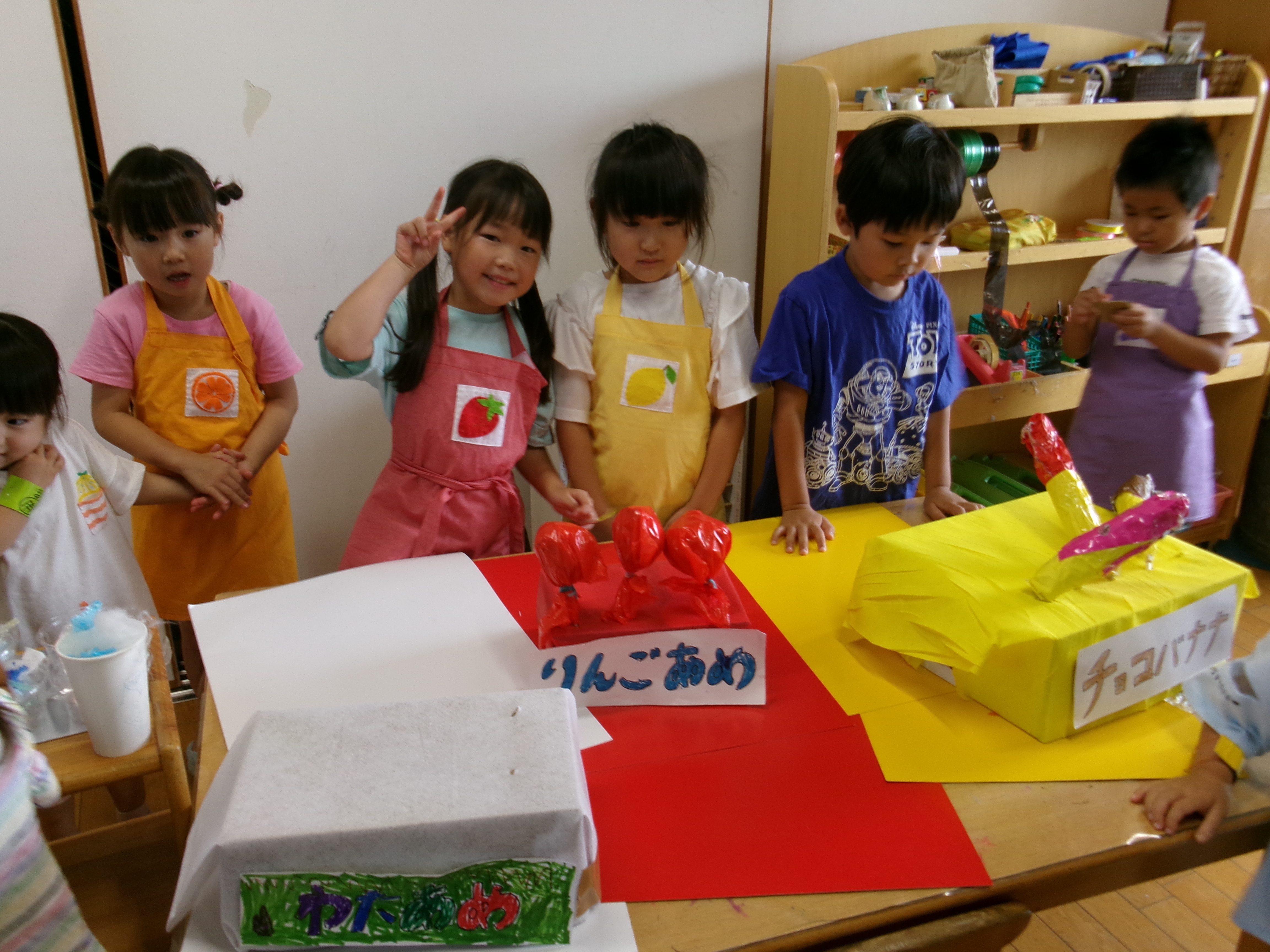 ひよこ組では子ども達が作った綿菓子、かき氷、りんご飴、落書きせんべいなどの出店が出ており、子ども達がお店屋さんにもなってくれました。