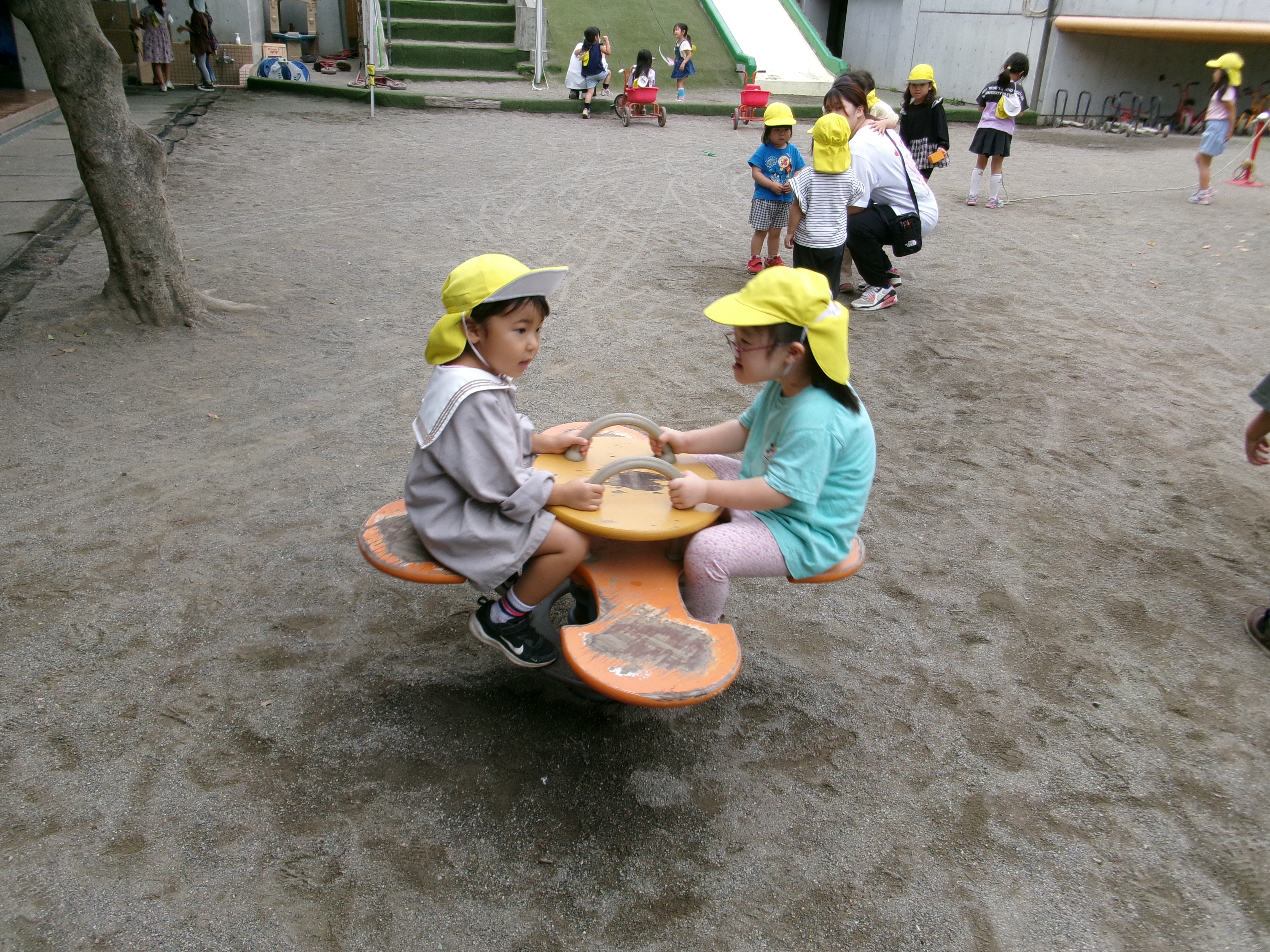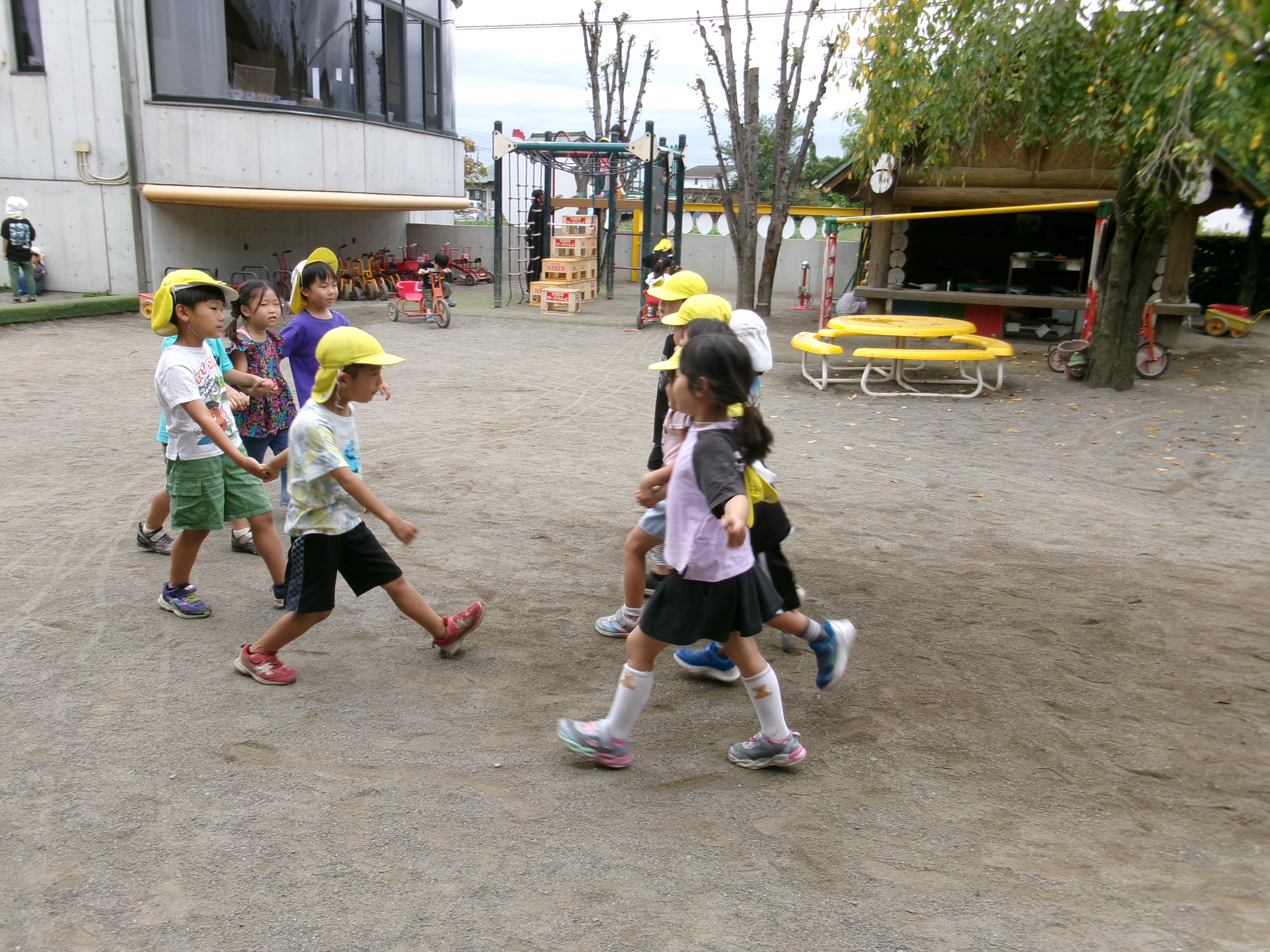 にわとり組の子が手をつないであそんでいるのは、「はないちもんめ」古くから伝わるあそびですが、今でも楽しいあそびの一つです。