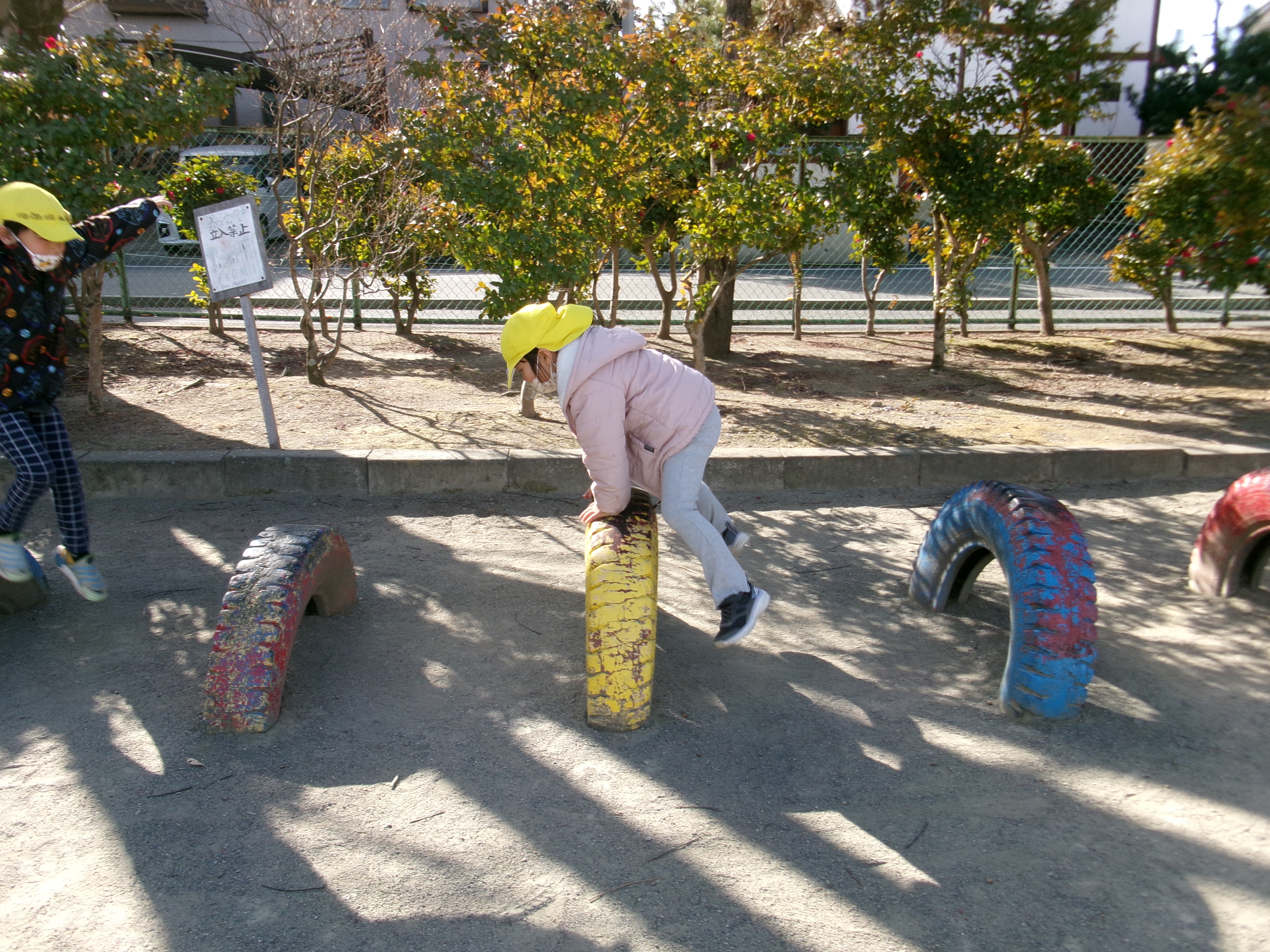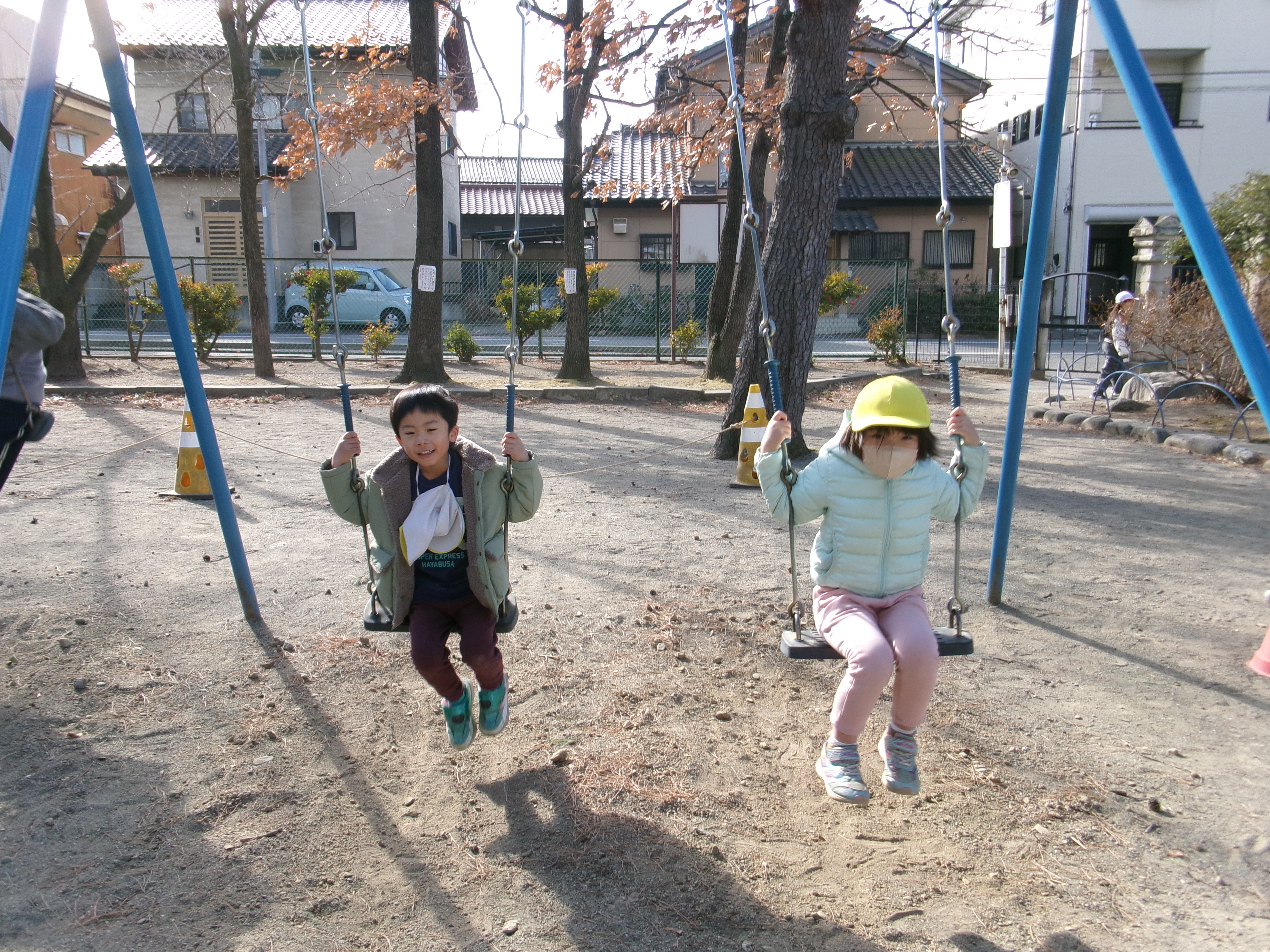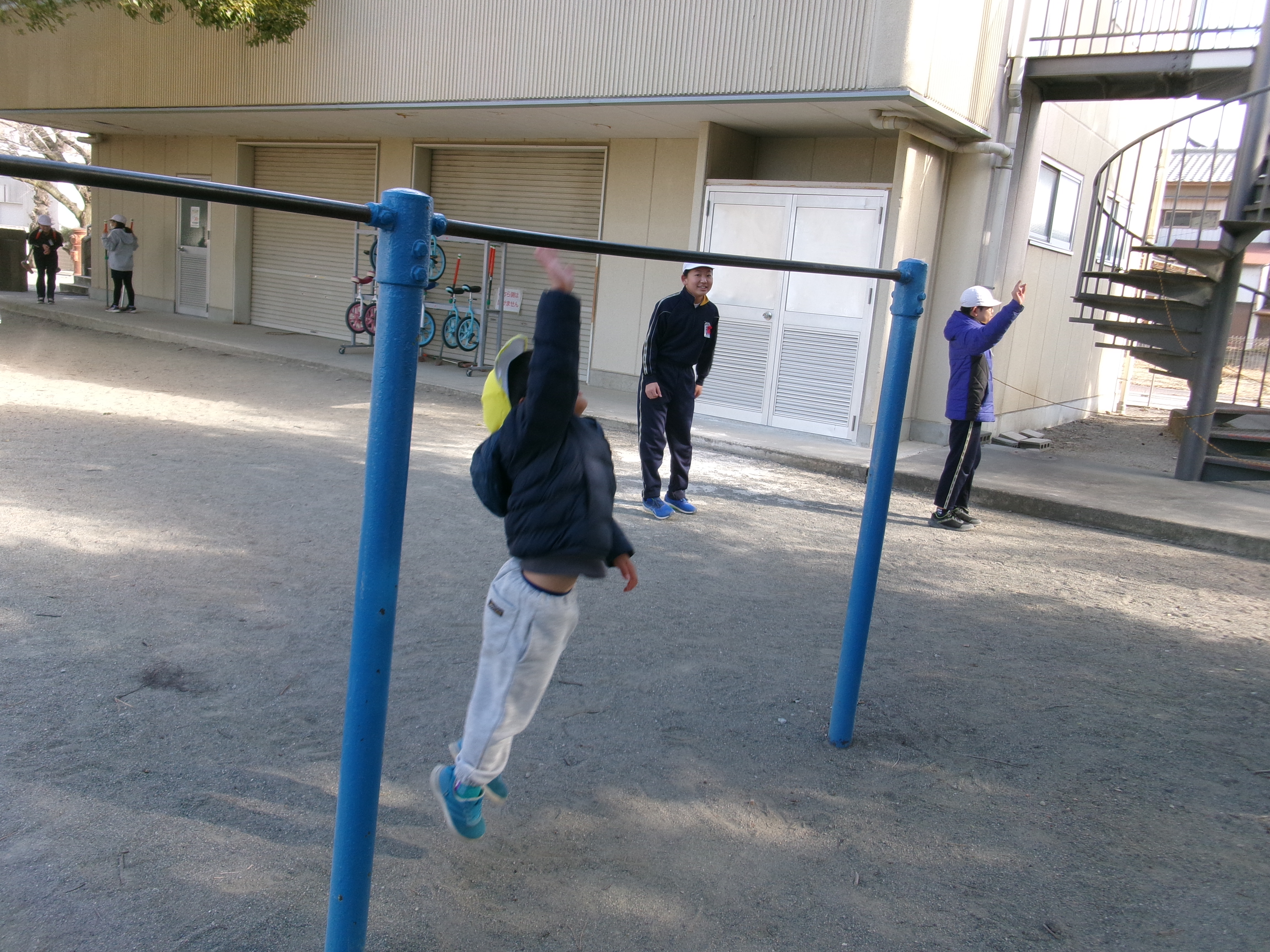 休み時間には、園庭に出てお兄さん、お姉さんに遊んでもらいました。保育園とは違い広い校庭でたくさんの人が遊んでいて、鐘が鳴ったら教室に帰るということに、驚いたようで「もうあそぶのおしまいなの?」と言う声もありました。