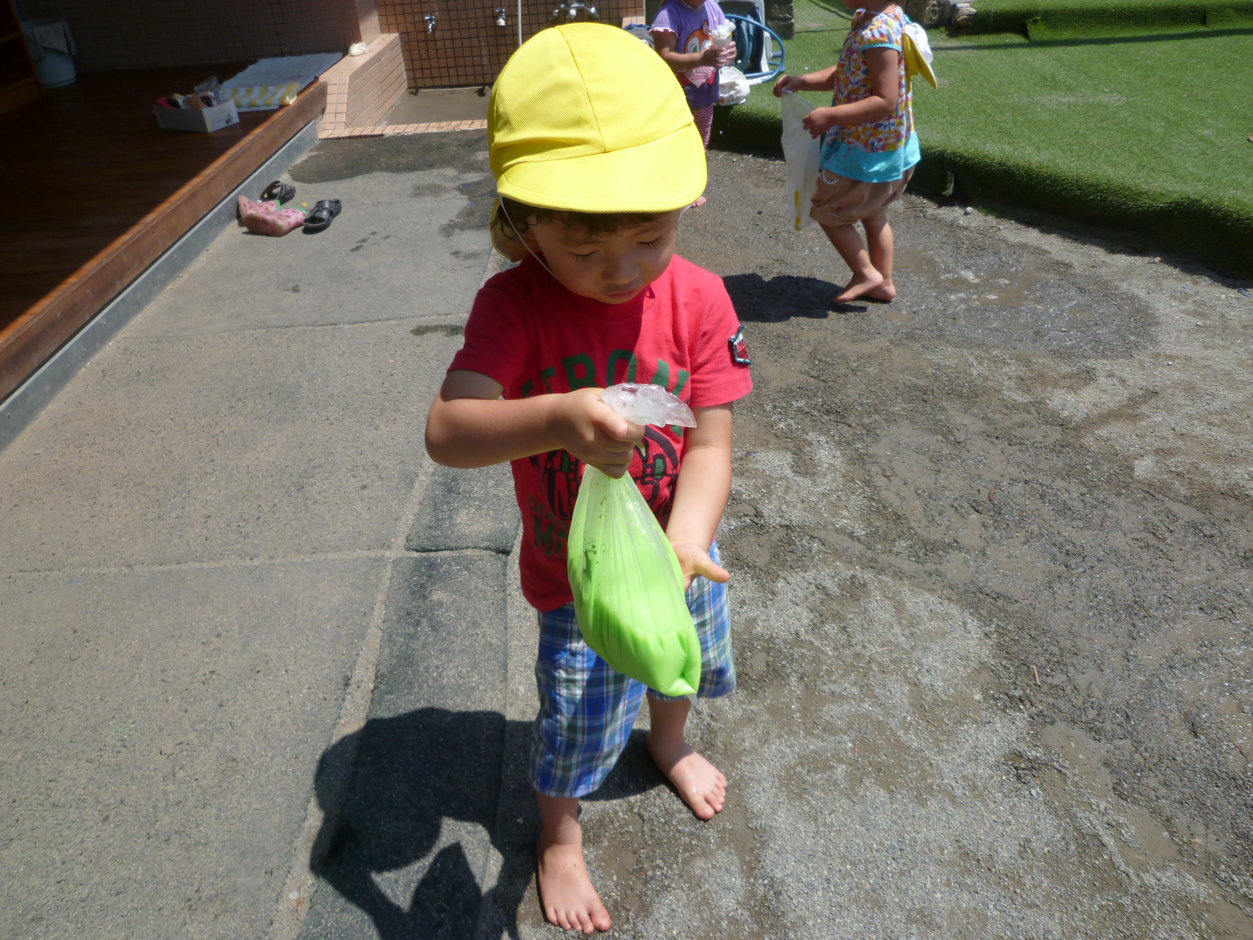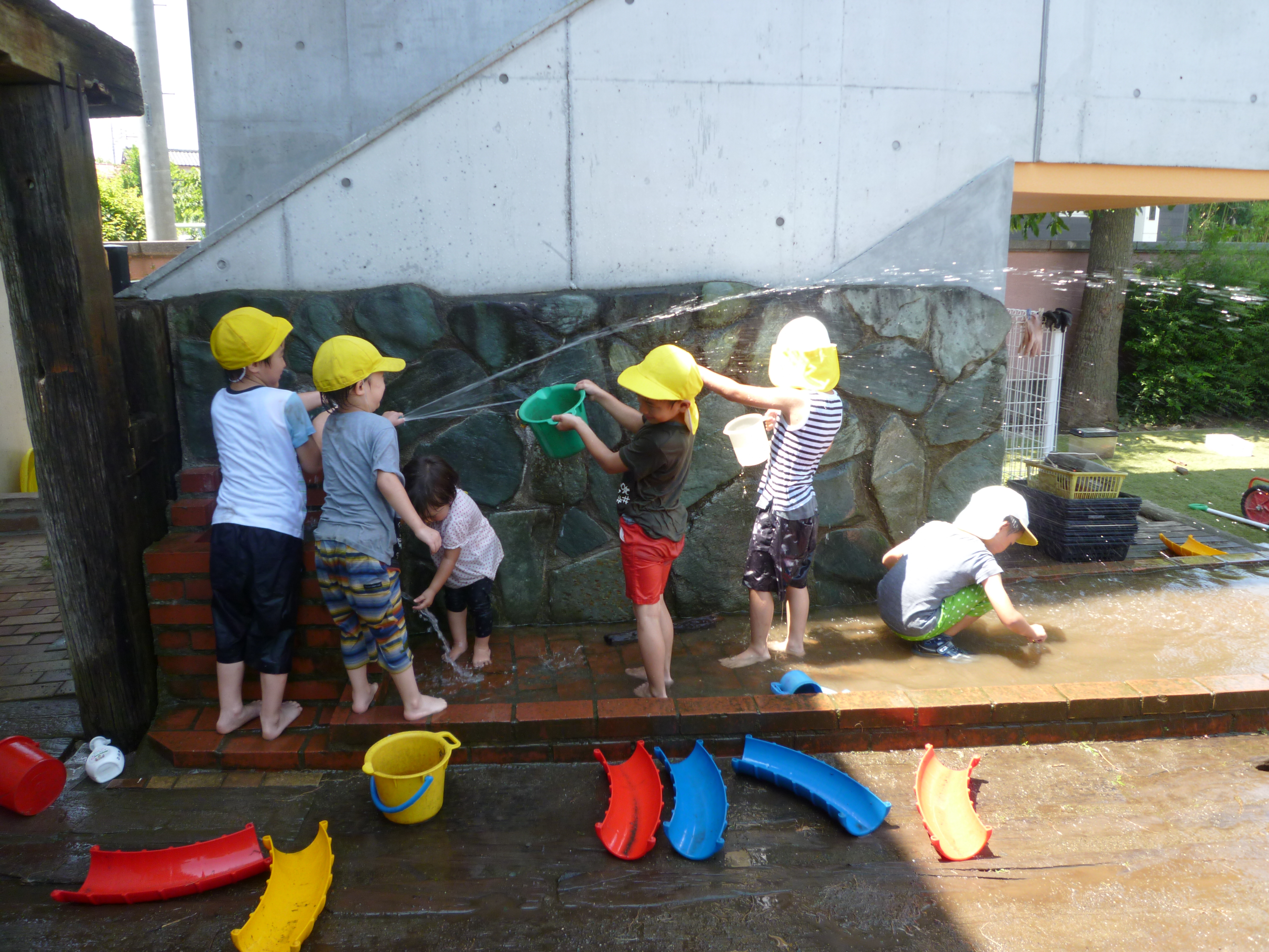 毎日暑い日が続いているので、今日も水遊びが始まりました。