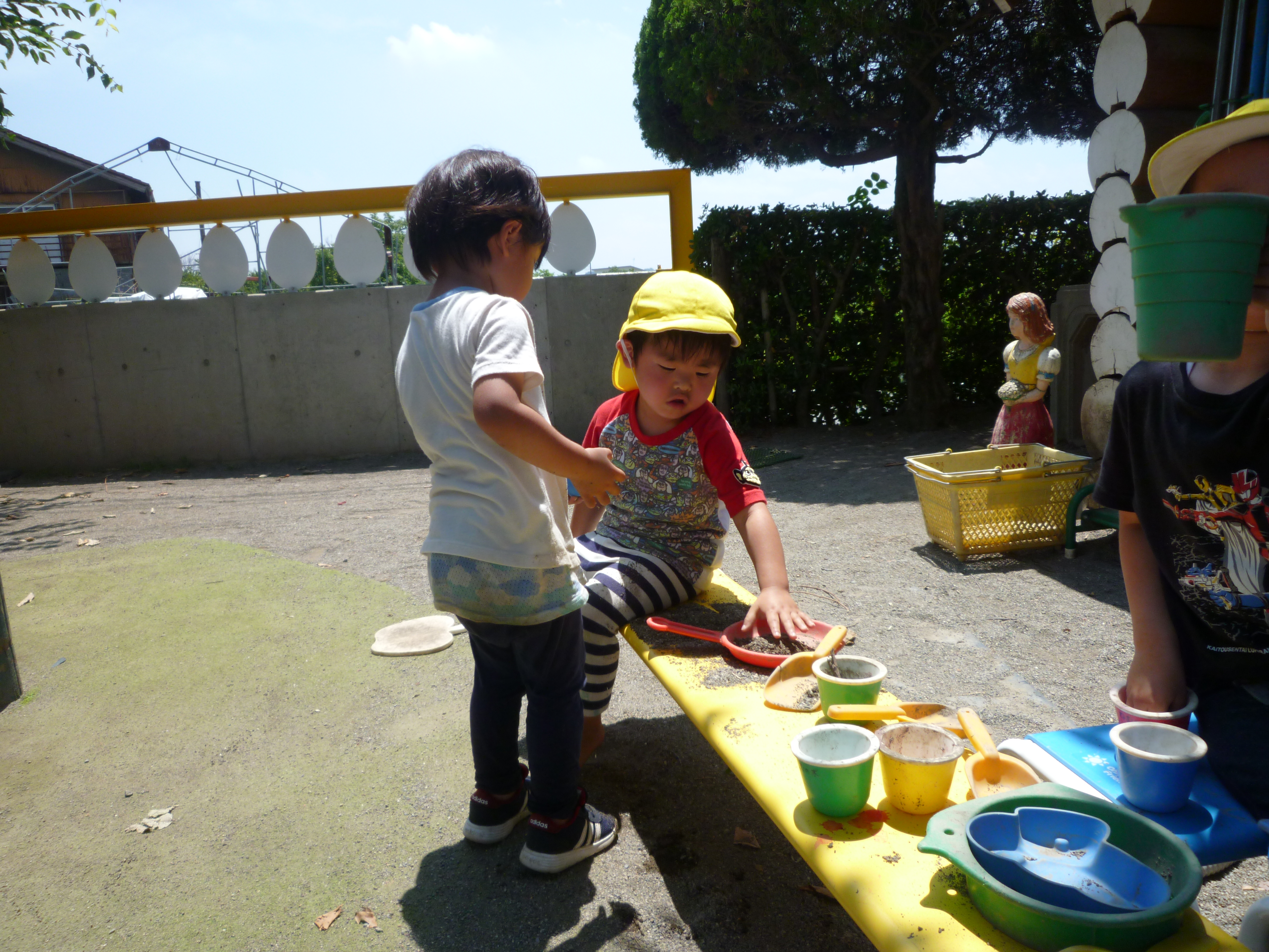 園庭の隅ではおままごとが始まっていました。ごはんを作ったり、友達に食べさせたり、友達とのやり取りもたくさん見られました。友達とのやり取りの中ではもちろんうまくいかないこともあります。でも、ちょっと我慢したり譲ったりしながら友達との関わりを楽しんでいました。