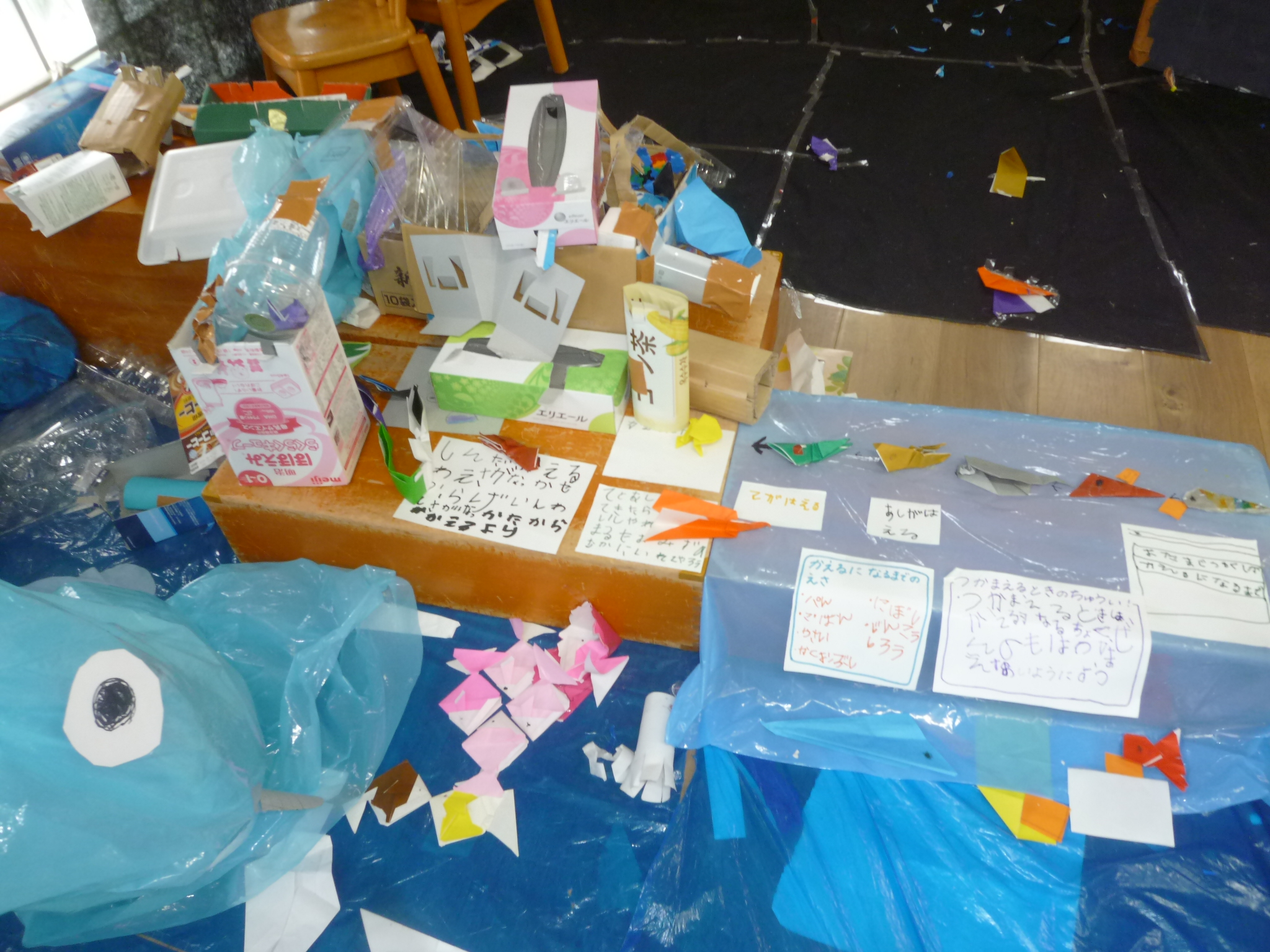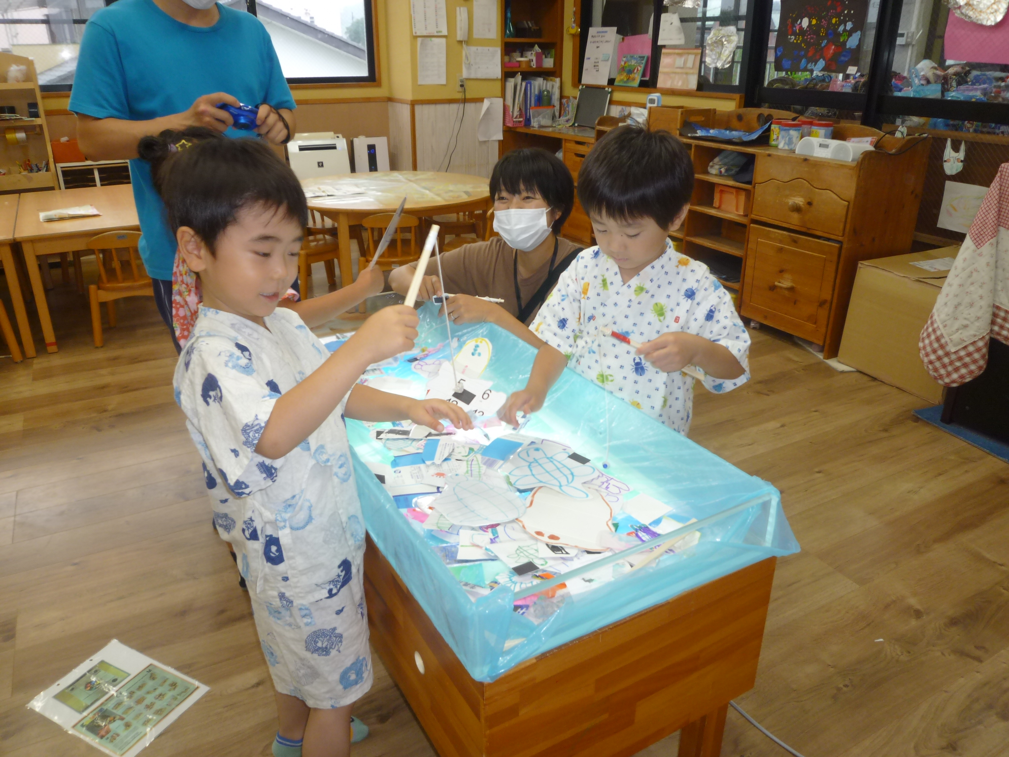 今年度はにわとり組が「カフェ」と「水族館」を行ってくれ、ぴよぴよ組やひよこ組も楽しんでいました。水族館は、4月の頃、「折り紙で何かつくりたいなぁ~」と子どもの声から始まり、たくさんの水の生き物を作り始めたことがきっかけとなり、3か月もの間水族館作りを行い、「じゃあ、夏祭りでみんなに見てもらおう!」ということになりました。