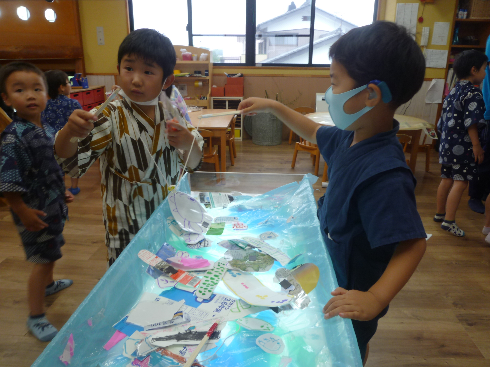 今日はあいにくの雨になってしまいましたが、室内で夏祭りごっこを行いました。